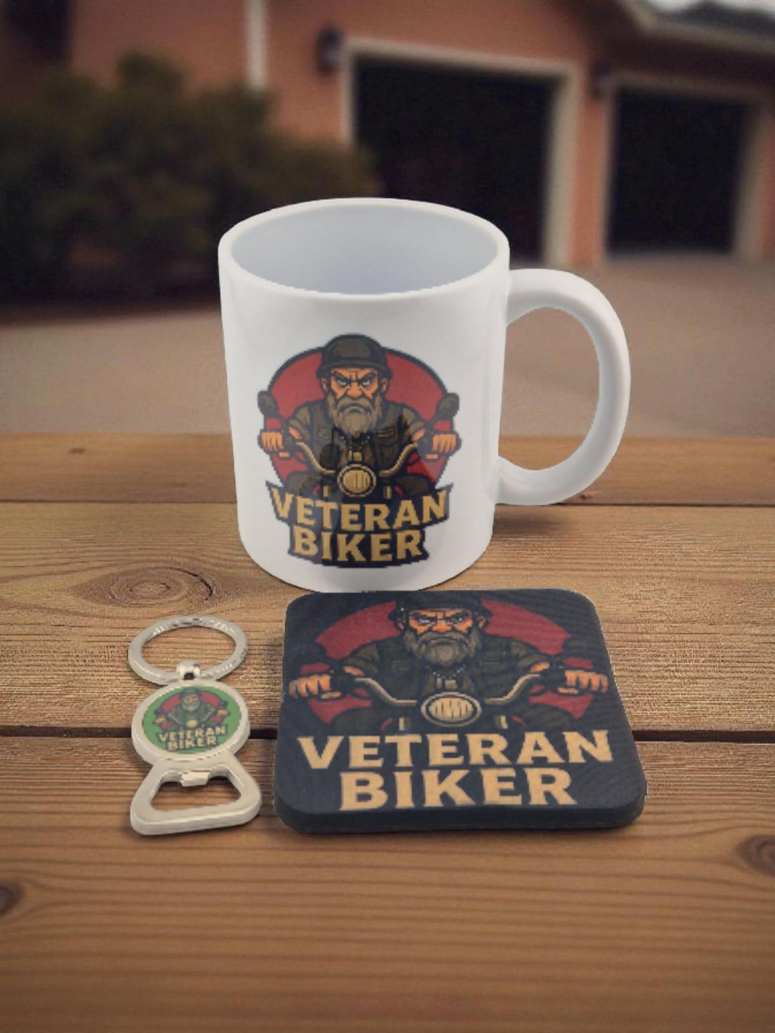 Celebrate the spirit of the open road with this bold Veteran Biker Gift Set. Featuring a grizzled, cartoon-style biker gripping the handlebars, this matching mug, coaster and keyring collection is perfect for military veterans who live for motorcycles, freedom, and a strong morning brew.