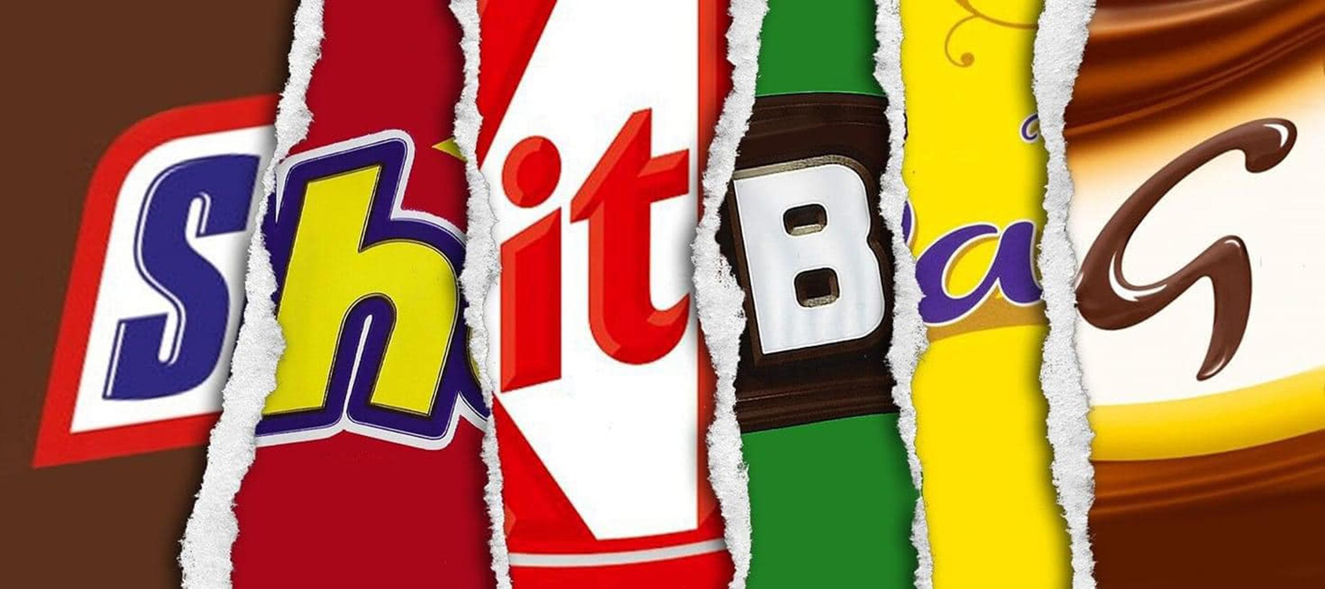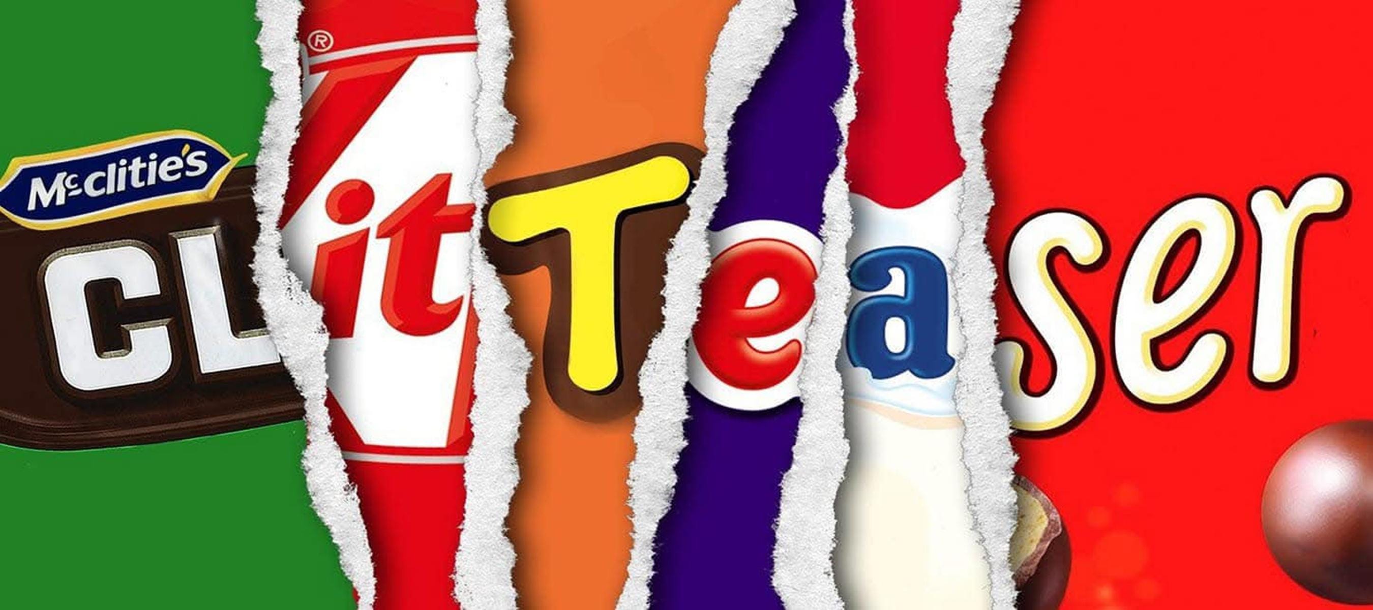 These mugs feature a torn-collage candy-wrapper style design that reveals fun, cheeky words across bold, colourful panels. Perfect for gifts, office laughs, or anyone who loves something a bit different!