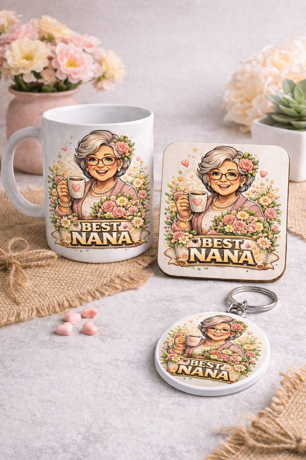 Best Nana Gift Set - Grandma Mug, Coaster & Keychain |Birthday Christmas Gift. Can be Personalised and design to look like your loved one