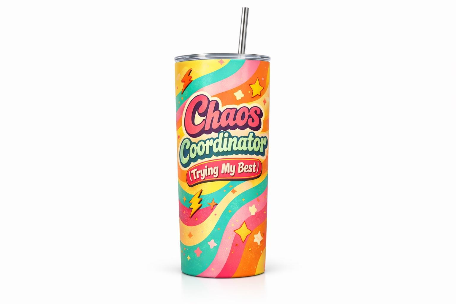 Our bright retro-style 20oz tumblers are packed with personality and designed for people who run on caffeine, chaos, and confidence.