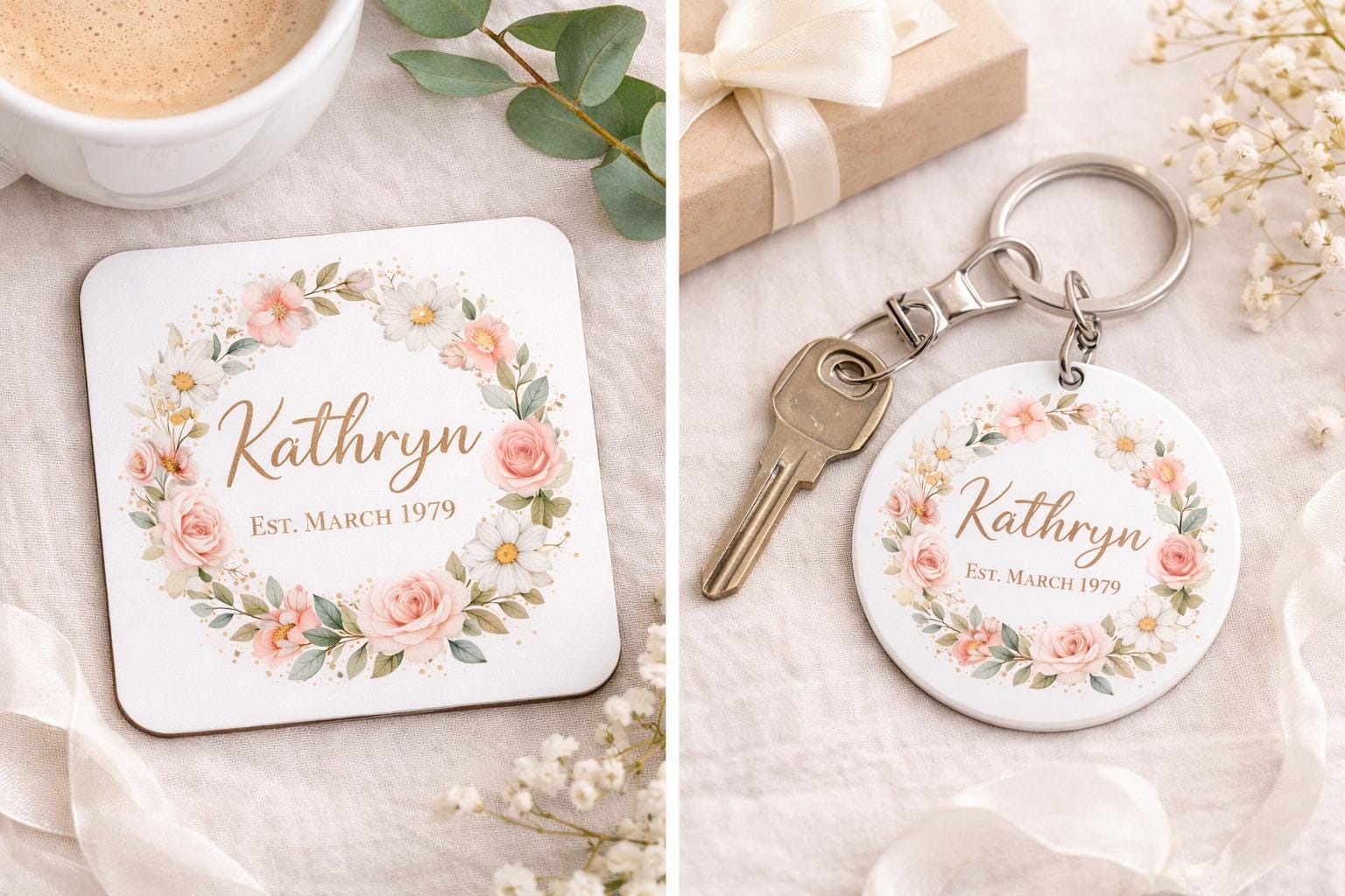 Create a truly special gift with this elegant personalised floral gift set, beautifully designed with a soft blush and botanical wreath. Featuring a matching ceramic mug, square coaster, and round keyring, this coordinated set is both practical and sentimental – perfect for celebrating birthdays, milestones, or simply someone special.