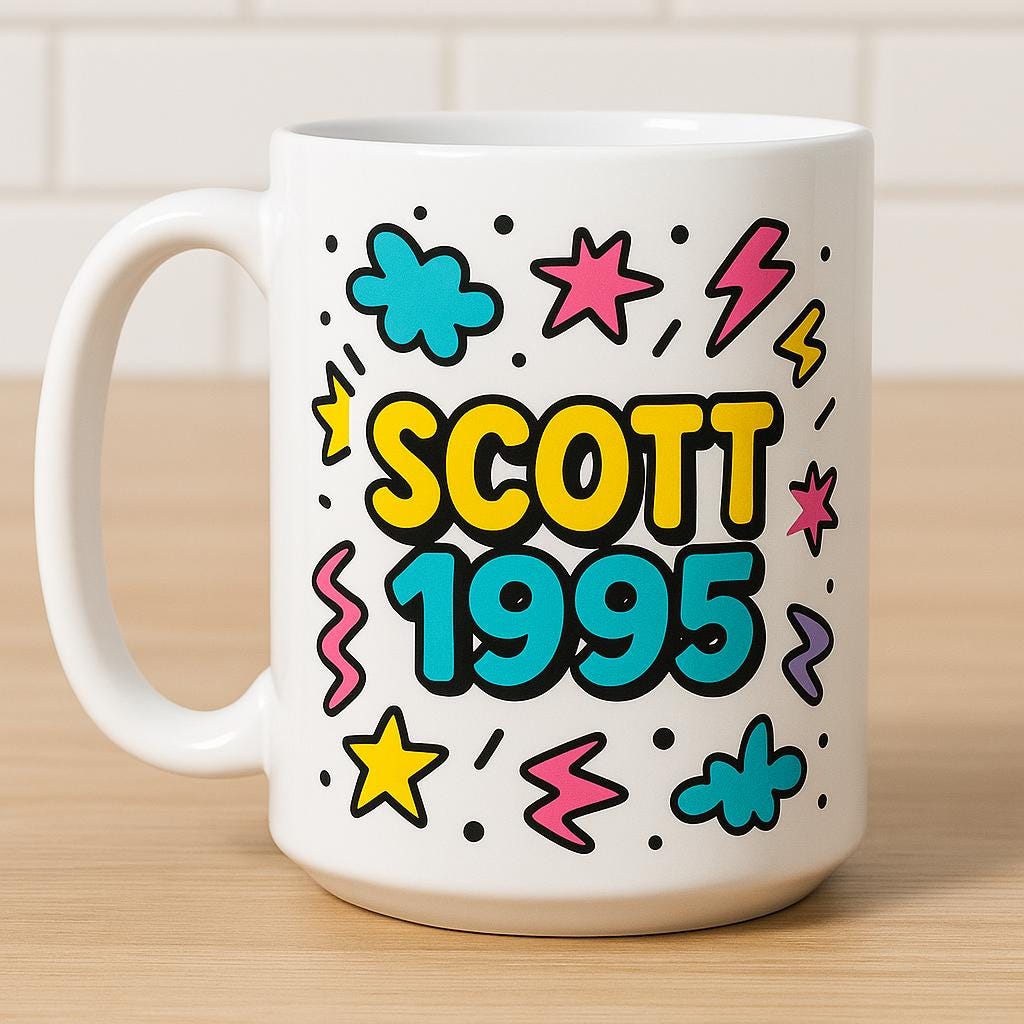 Bring back the bold, colourful vibes of the 1990s with this retro cartoon-style personalised mug and tumbler. Featuring playful doodles, bright colours, and thick black outlines, this design is inspired by classic 90s cartoons and nostalgia culture. Perfect for anyone who grew up in the 90s or loves retro style drinkware.