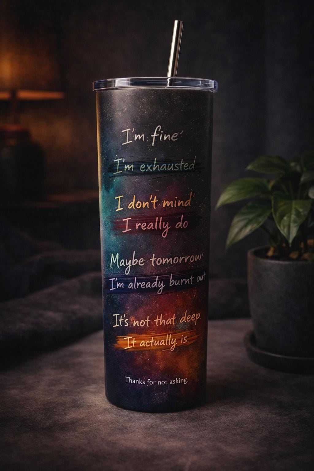 This 20oz straight sublimation tumbler features a dark, moody design layered with honest thoughts we all say out loud… and the ones we don’t. Each phrase is crossed out to reveal what’s really underneath, finished with the quietly powerful line: