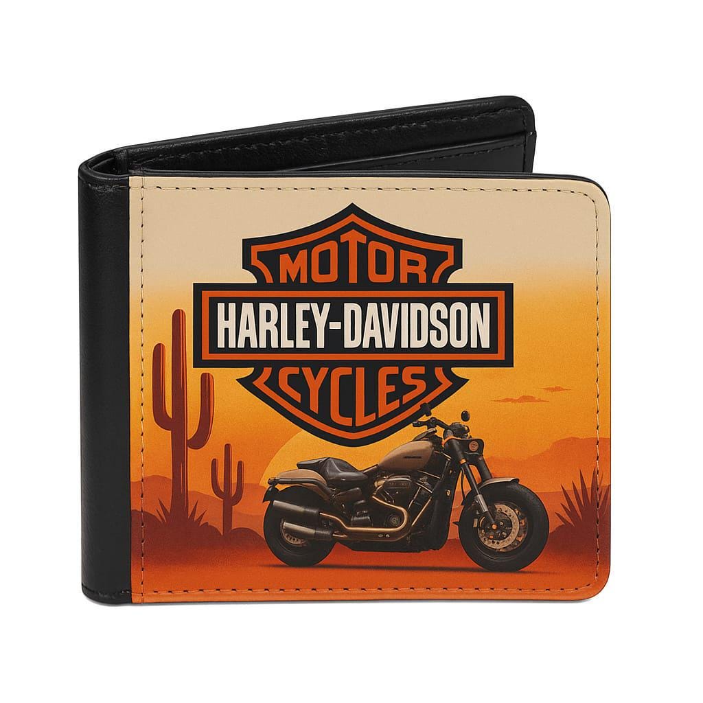 A bold, biker-inspired wallet designed for true motorcycle lovers. Featuring a striking Harley-style motorcycle scene, this wallet can be fully customised to your chosen Harley model and colour, making it a truly personal gift or everyday essential.