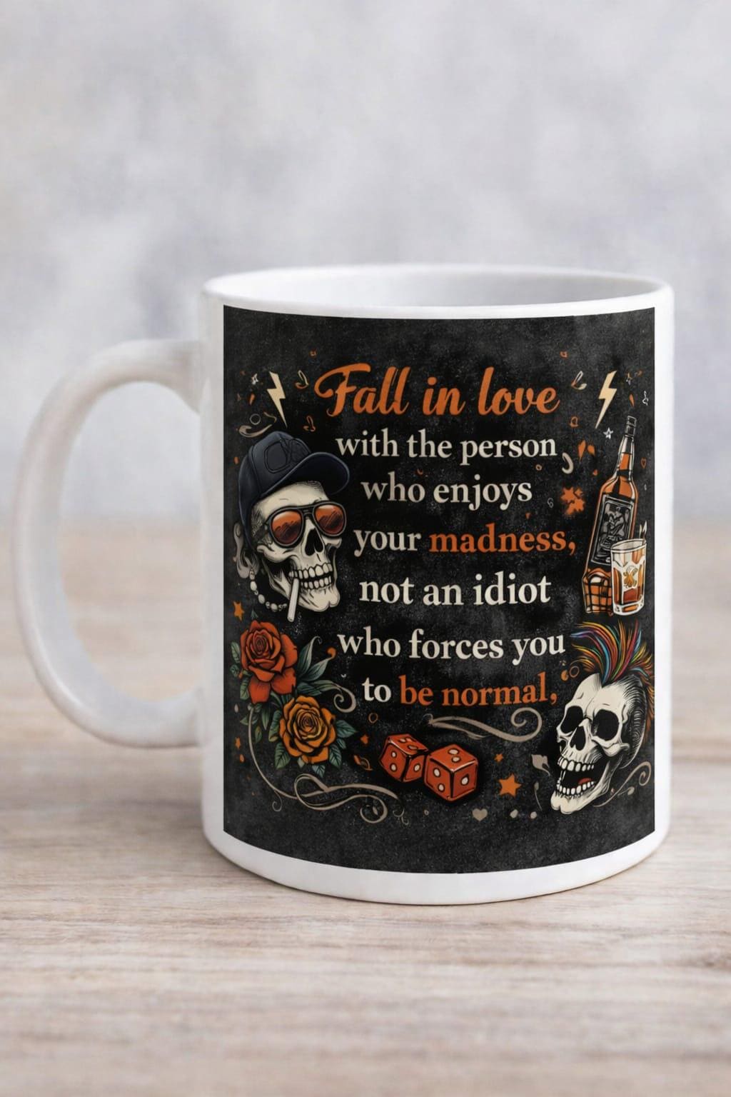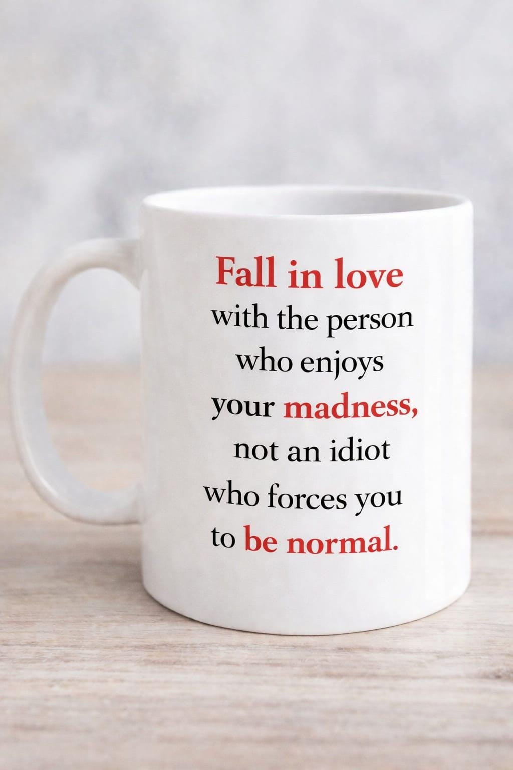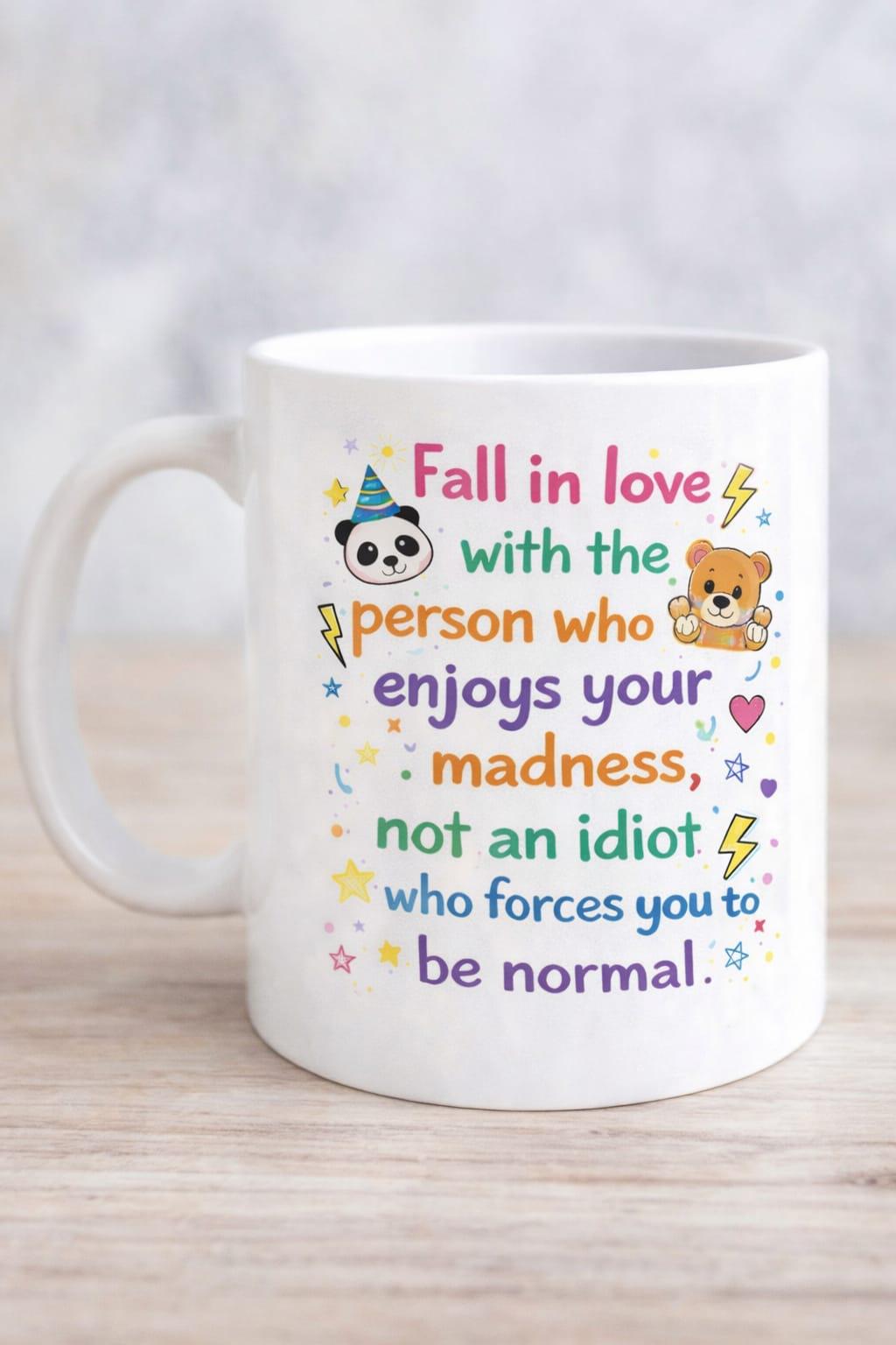 This fun and colourful mug is a reminder to embrace your quirks and never settle for anyone who tries to change you. Featuring the playful quote “Fall in love with the person who enjoys your madness, not an idiot who forces you to be normal”, it’s full of charm, humour, and personality.