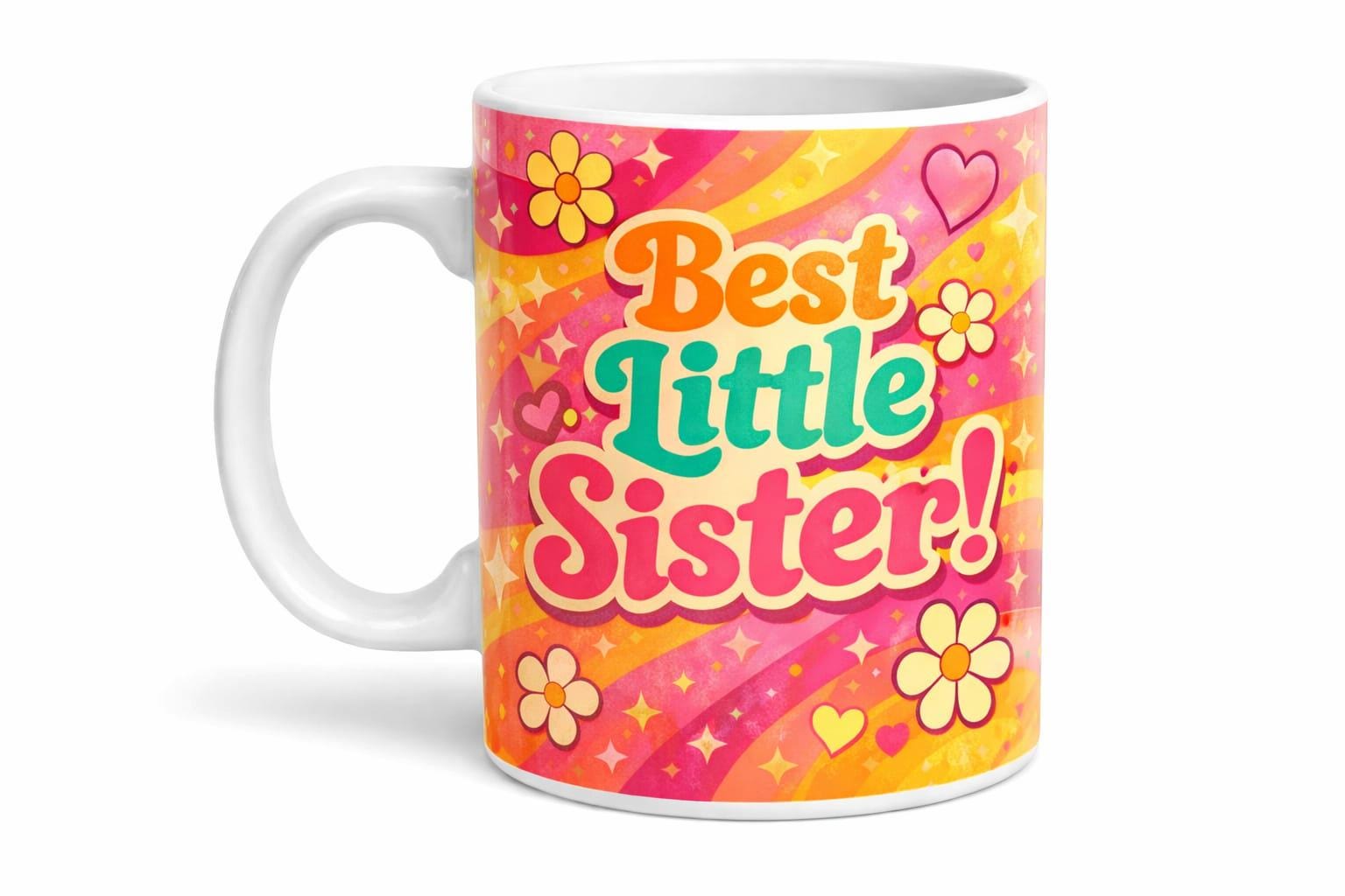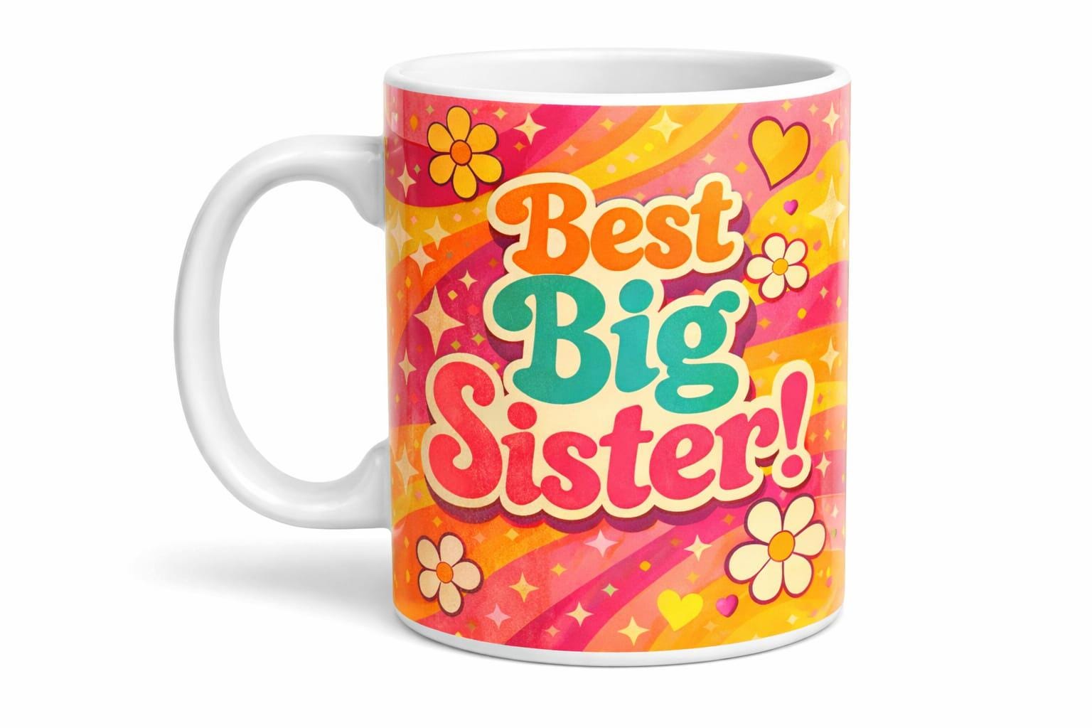 Celebrate the world’s best sister with this bold, colourful mug that’s guaranteed to make her smile. Featuring the fun and uplifting message “Best Big/Little Sister!”, this design bursts with retro-inspired colours, playful florals, hearts, and a joyful vintage vibe.