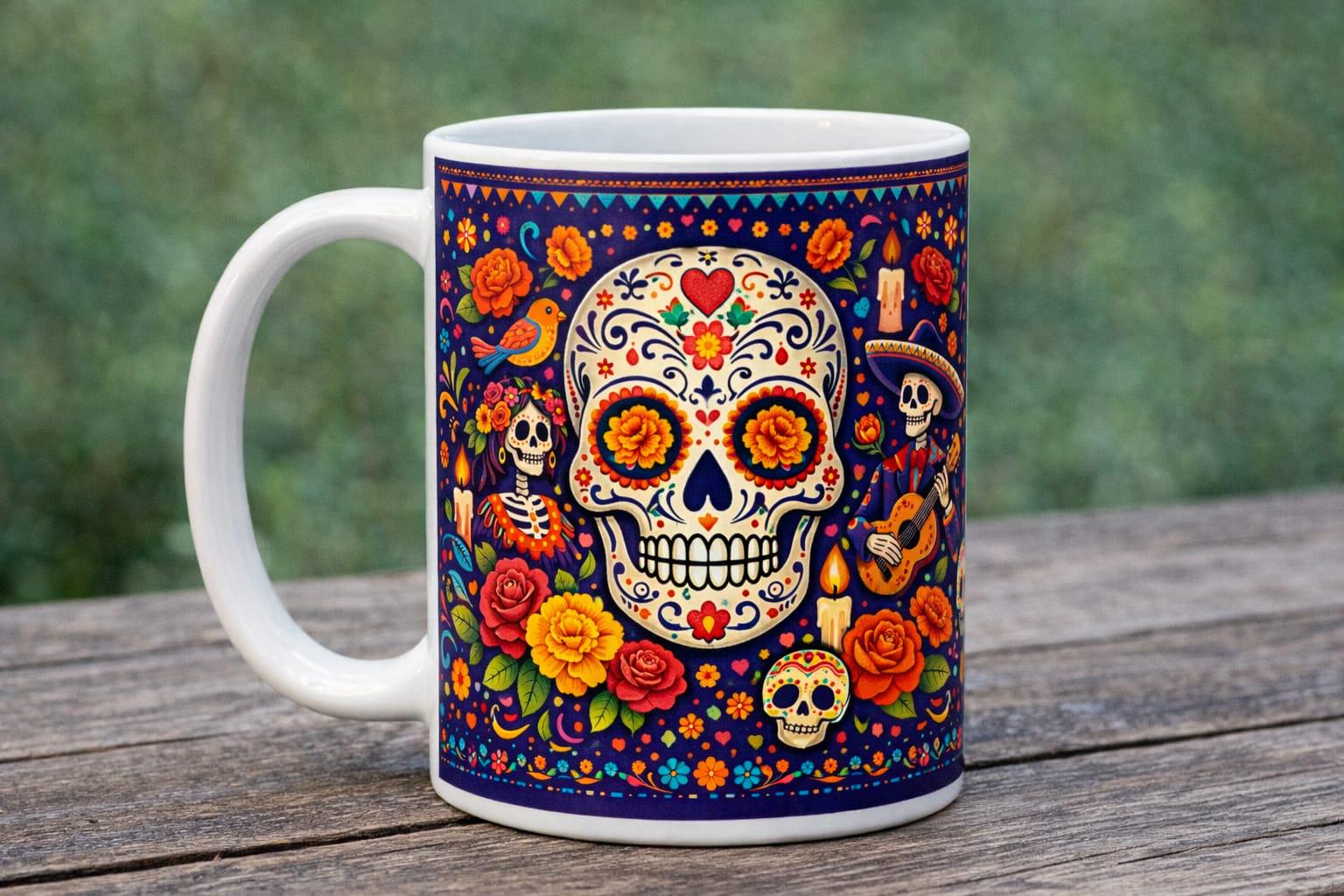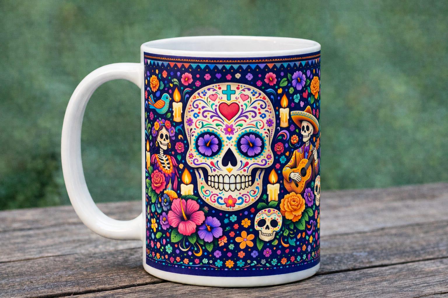 Celebrate life, memory, and artistry with this stunning Day of the Dead–inspired mug. Featuring beautifully detailed sugar skull artwork surrounded by vibrant flowers, candles, birds, and traditional folk motifs, this design is bursting with colour and meaning.
