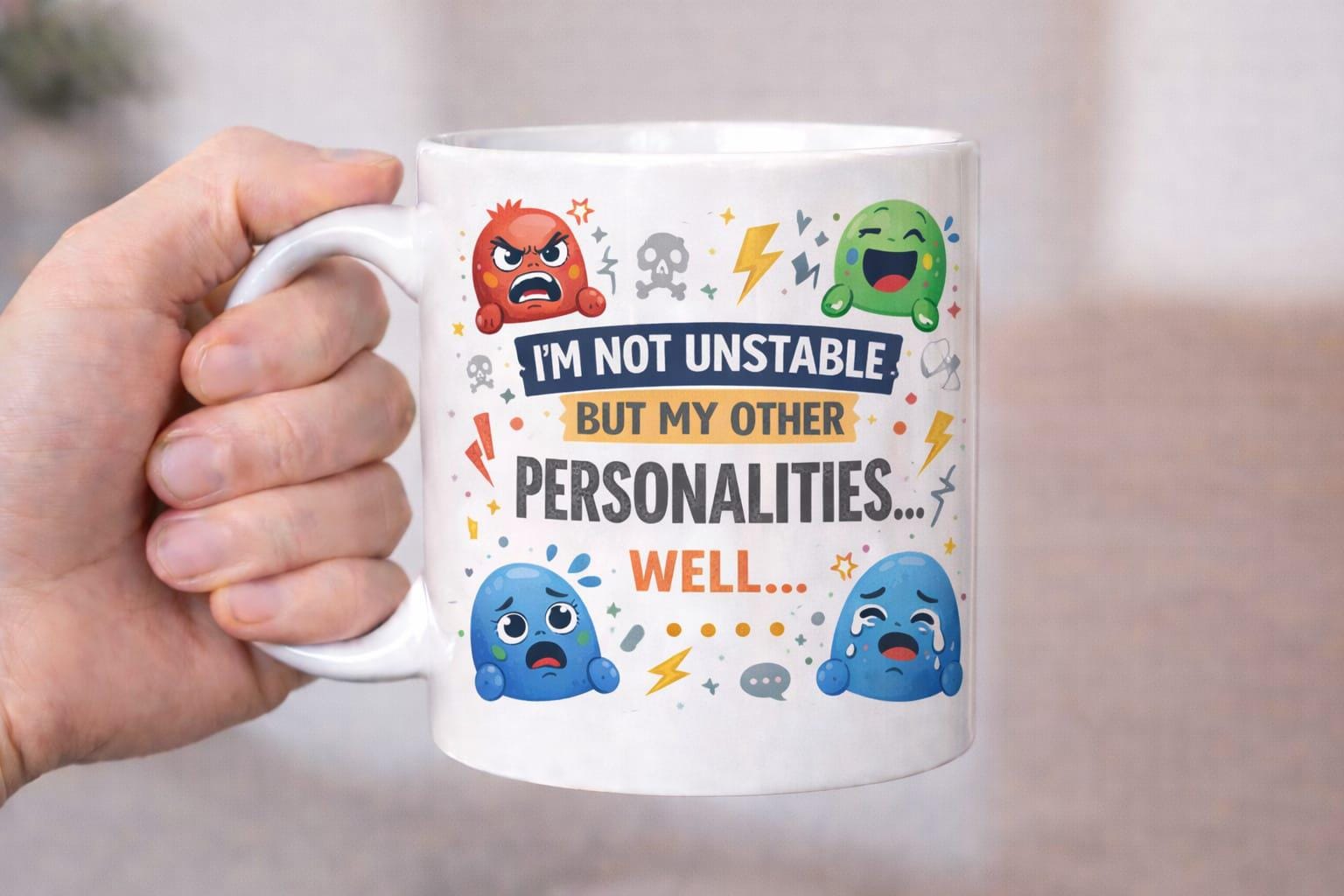 Add a dose of humour to your daily brew with this light-hearted and colourful mug. Featuring the funny quote “I’m not unstable, but my other personalities… well…” alongside expressive cartoon characters, this design is packed with personality and laughs.