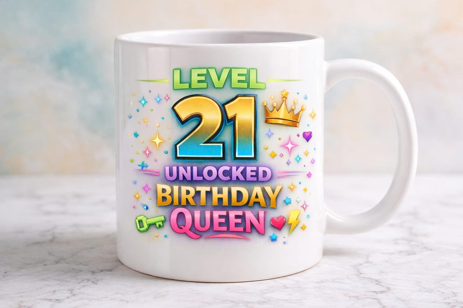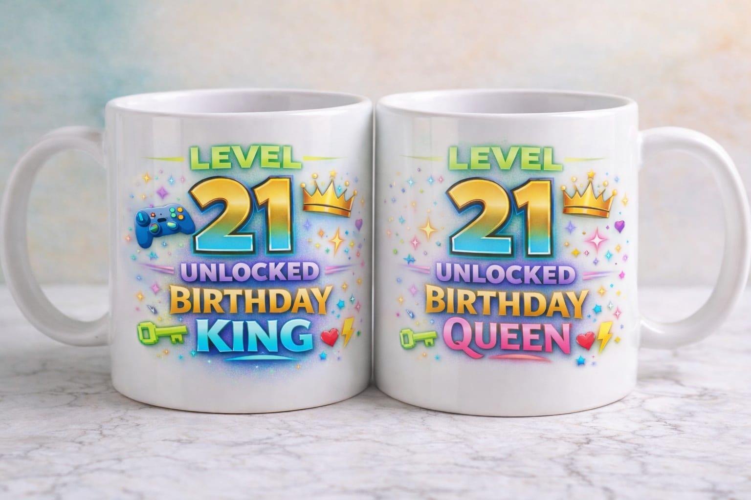 Celebrate turning 21 in style with this bold and playful Level 21 Unlocked – Birthday Queen mug. Designed with a colourful gaming-inspired theme, sparkling accents, and a golden crown, this mug marks the milestone birthday like a true achievement unlocked.