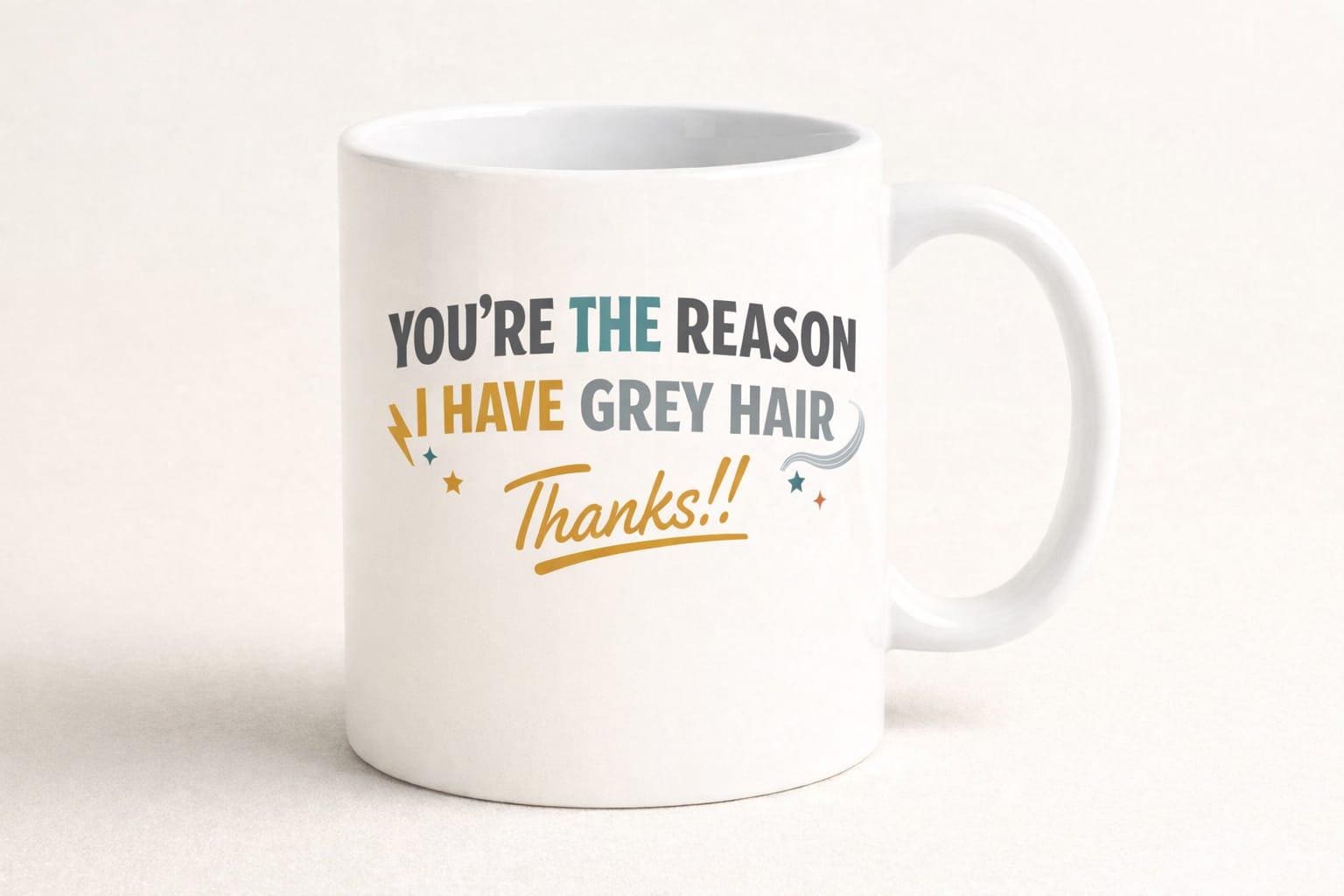 A cheeky, light-hearted mug that says what we’re all thinking. Featuring the playful phrase “You’re the reason I have grey hair – Thanks!!”, this design uses a mix of bold typography, soft accent colours, and subtle icons to keep it funny without being harsh.