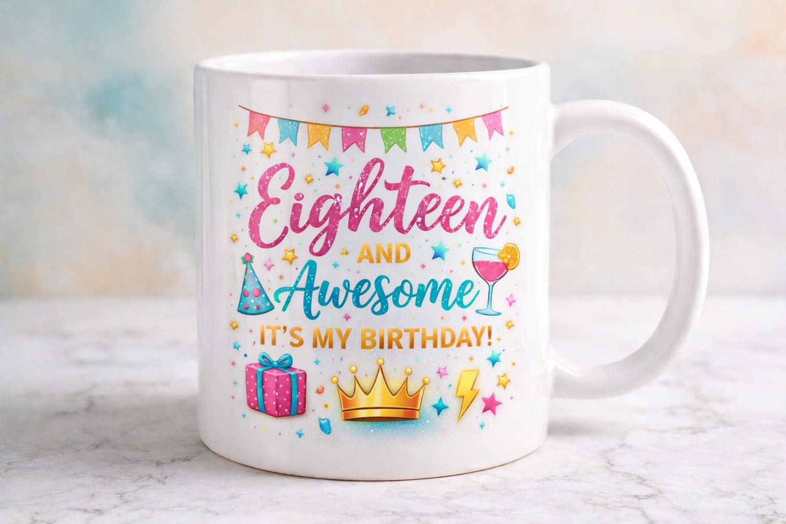 A fun, feel-good birthday mug made for turning eighteen and owning it. 🎉👑✨