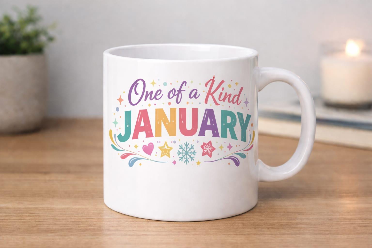 Celebrate a January birthday with this colourful and uplifting mug featuring the phrase “One of a Kind January.” Designed with playful typography, soft pastel tones, and seasonal decorative icons, this mug is full of personality and charm.