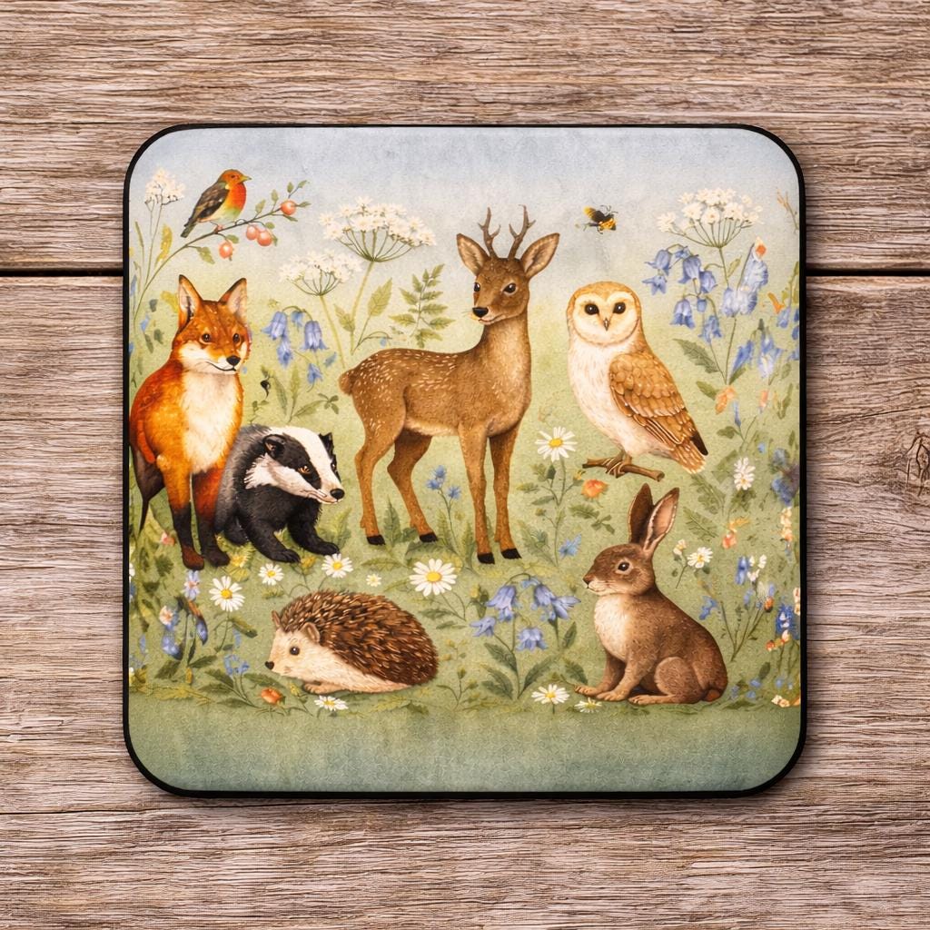 Add a touch of the British countryside to your home with this beautiful set of four matching neoprene coasters, each featuring the same detailed British wildlife illustration. The artwork showcases much loved woodland animals including a fox, badger, deer, barn owl, hedgehog and hare, nestled amongst wildflowers and soft greenery in a calming watercolour style.