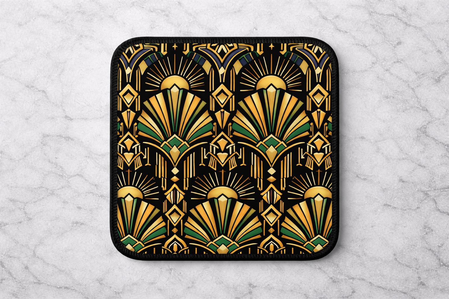 Add instant glamour to your coffee table with this stunning set of four Art Deco inspired neoprene coasters. Featuring a bold geometric pattern in black, gold, and emerald green, these coasters draw on classic 1920s design with elegant fan and sunburst motifs that feel both luxurious and timeless.