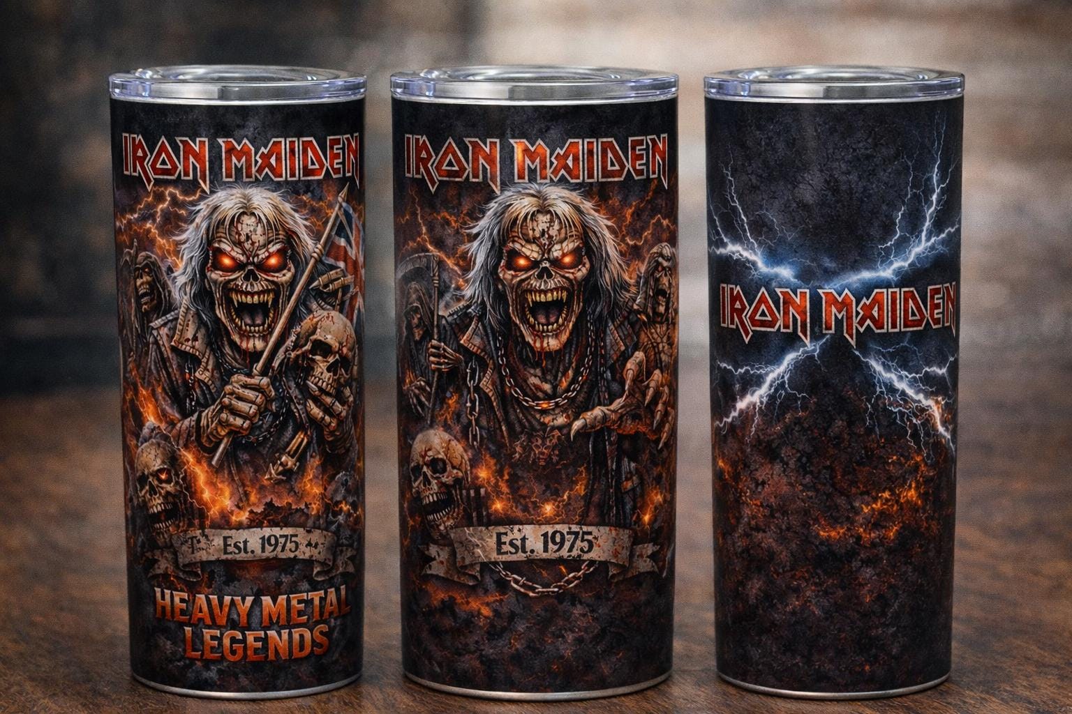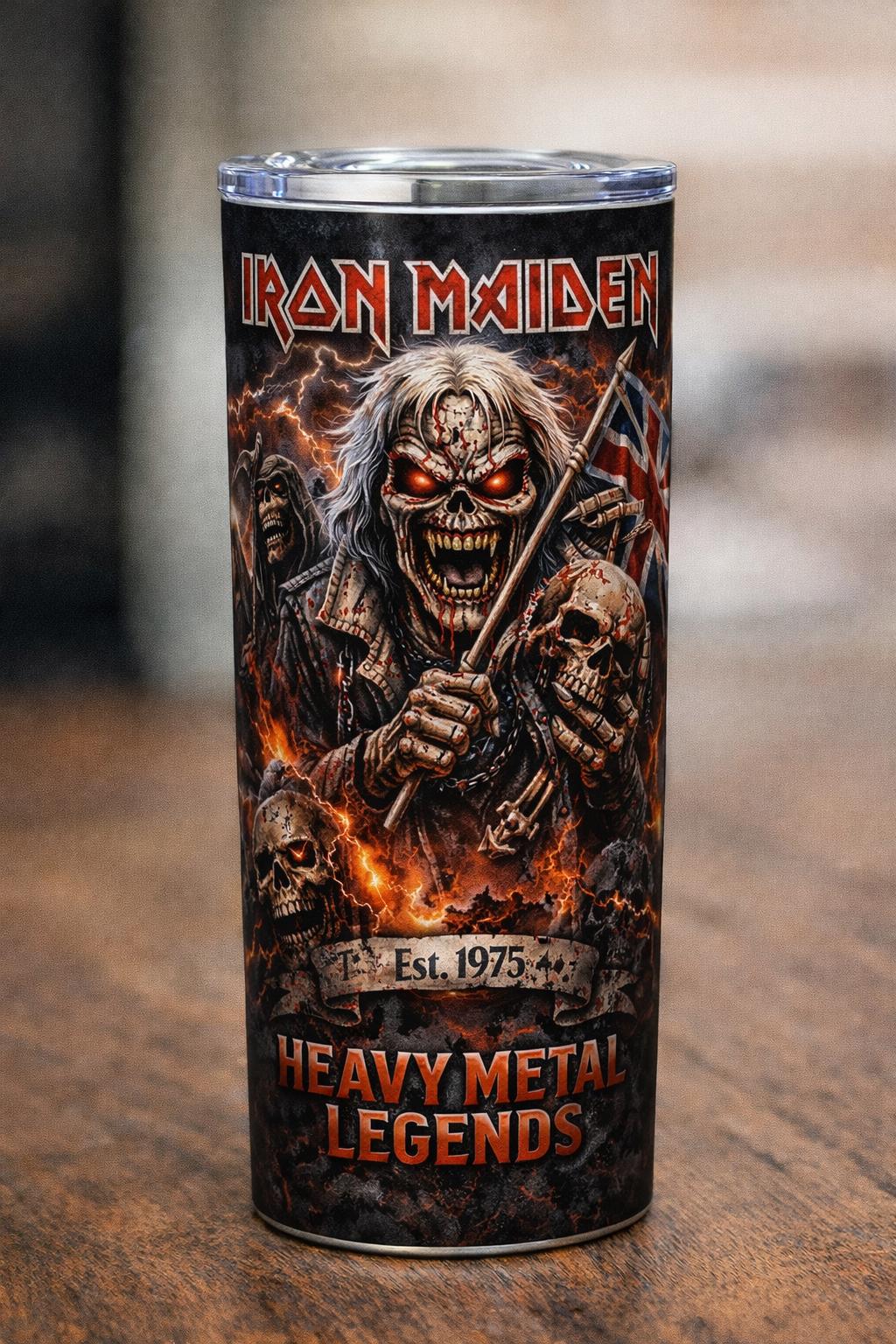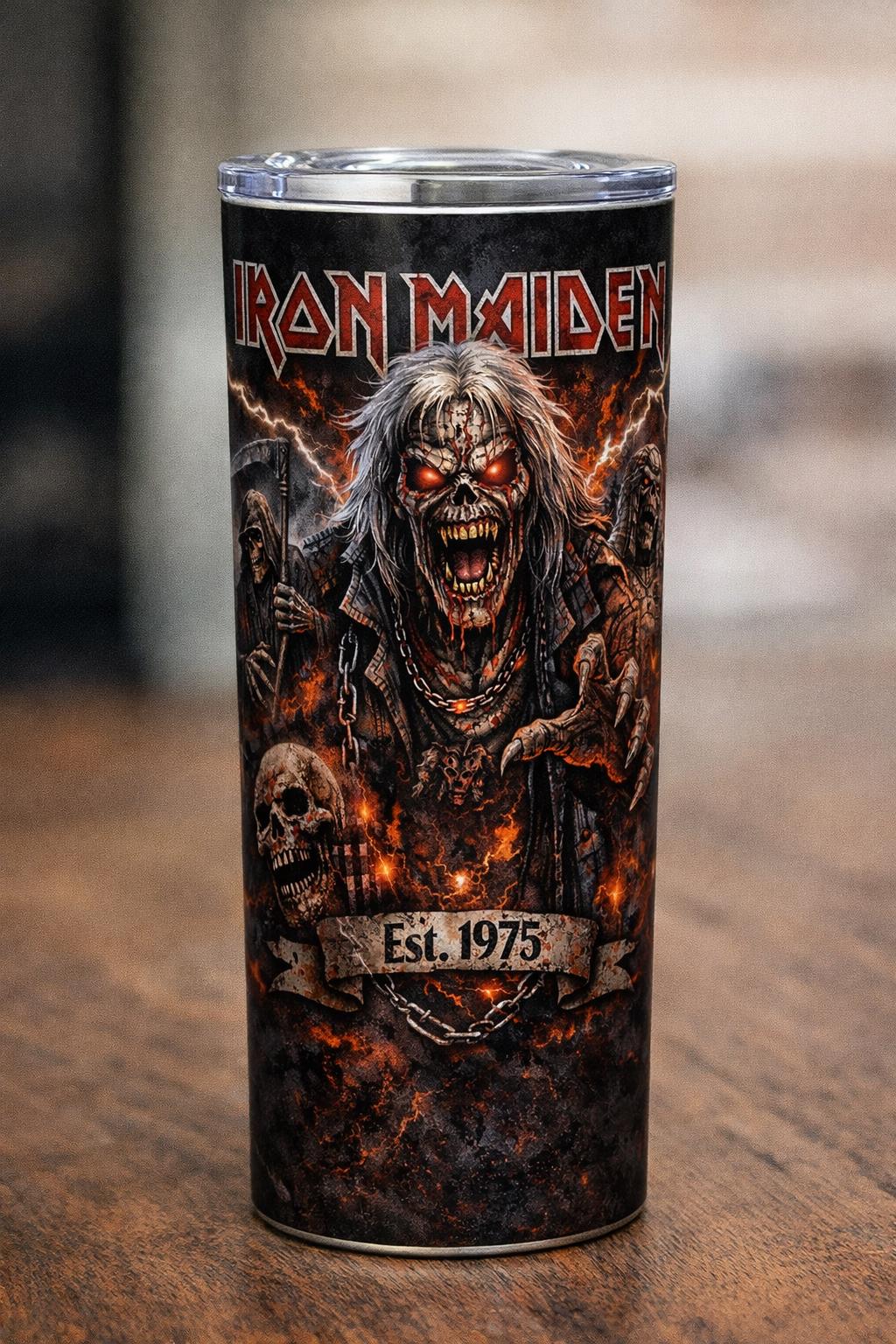 Turn up the volume on your drinkware with this Iron Maiden inspired heavy metal tumbler, featuring bold artwork of the iconic Eddie, lightning effects, and a dark fiery metal texture that wraps fully around the tumbler. Designed for true metal fans, this statement piece celebrates the legacy of heavy metal with an aggressive, high-impact design that stands out wherever you take it.