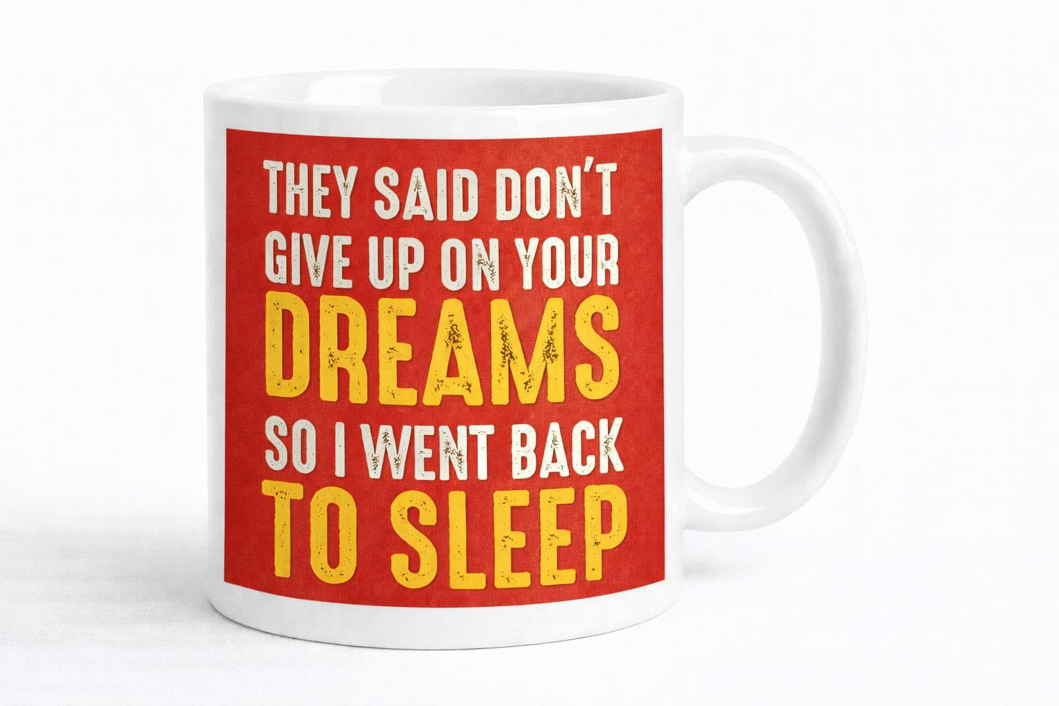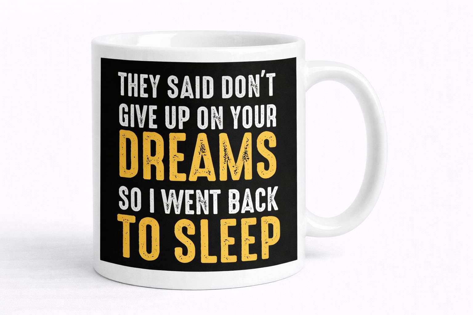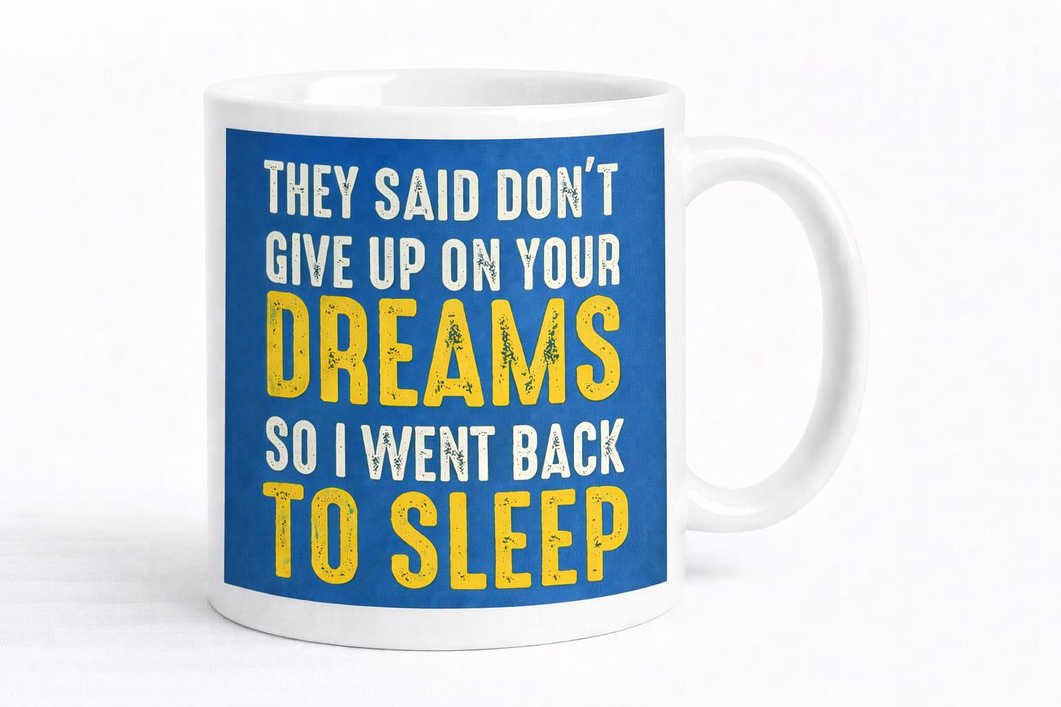 “They said don’t give up on your dreams… so I went back to sleep”, printed in eye-catching yellow and white text on a rich blue background.