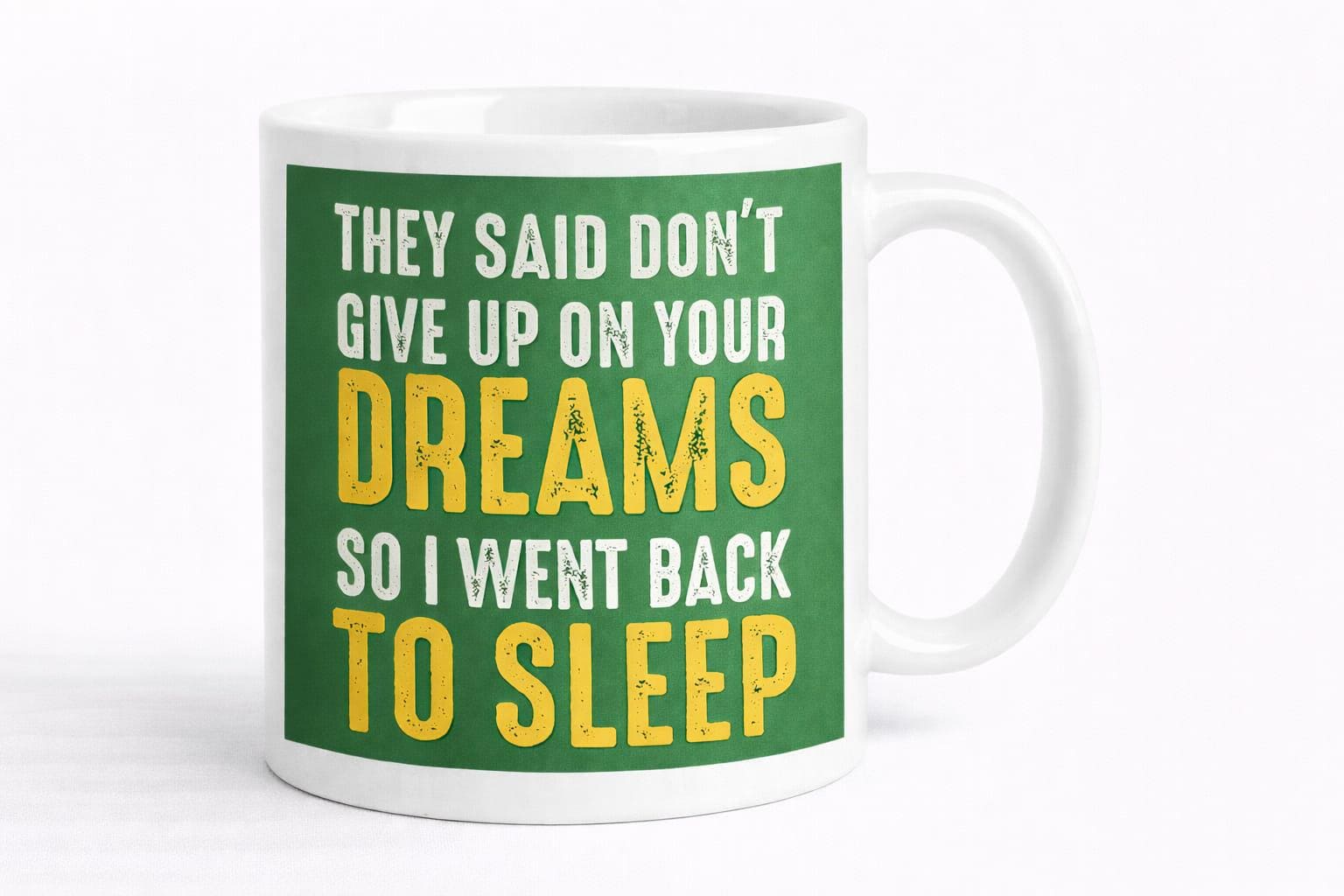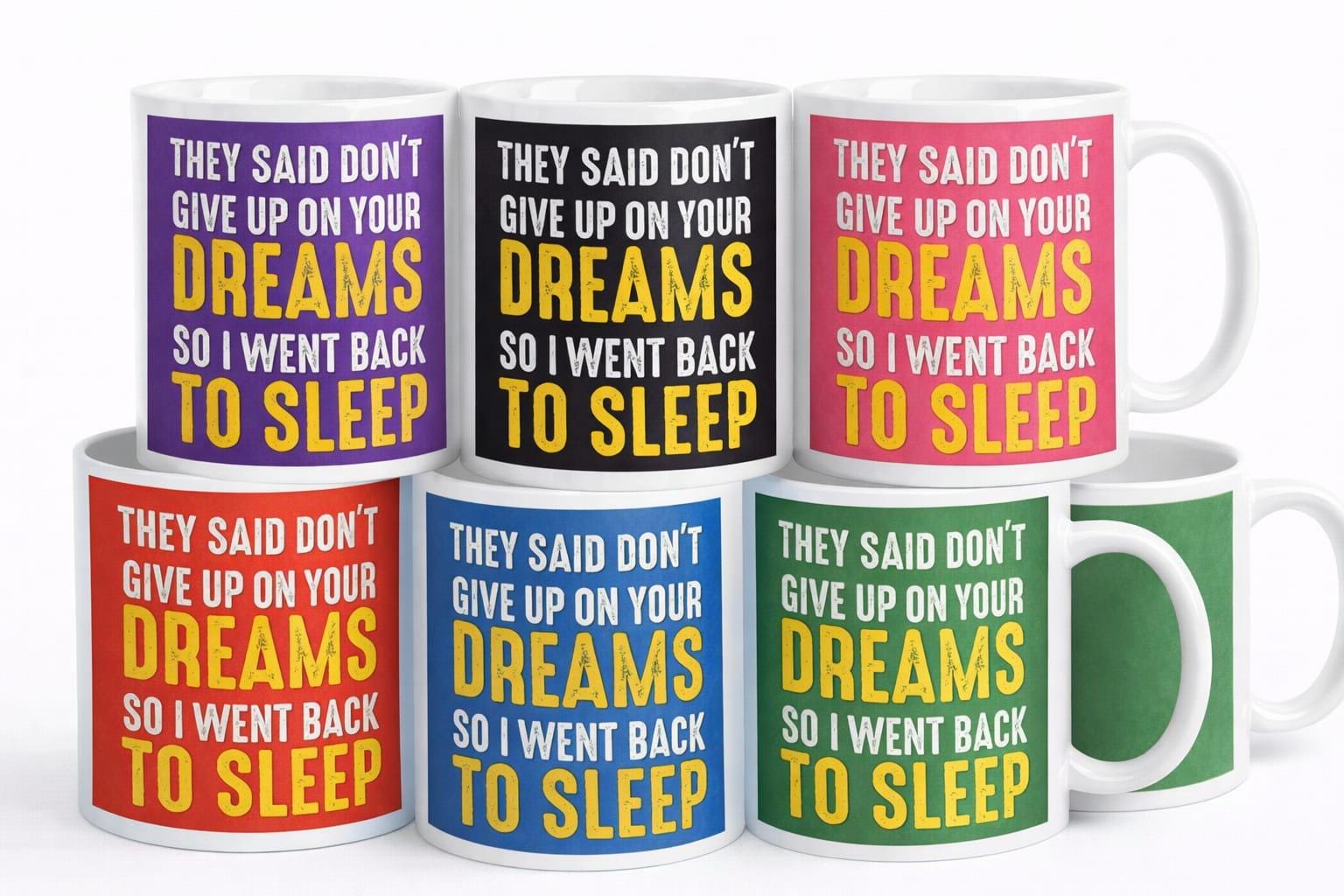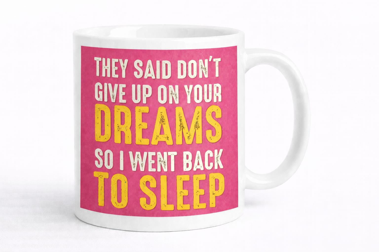 “They said don’t give up on your dreams… so I went back to sleep”, printed in eye-catching yellow and white text on a rich blue background.