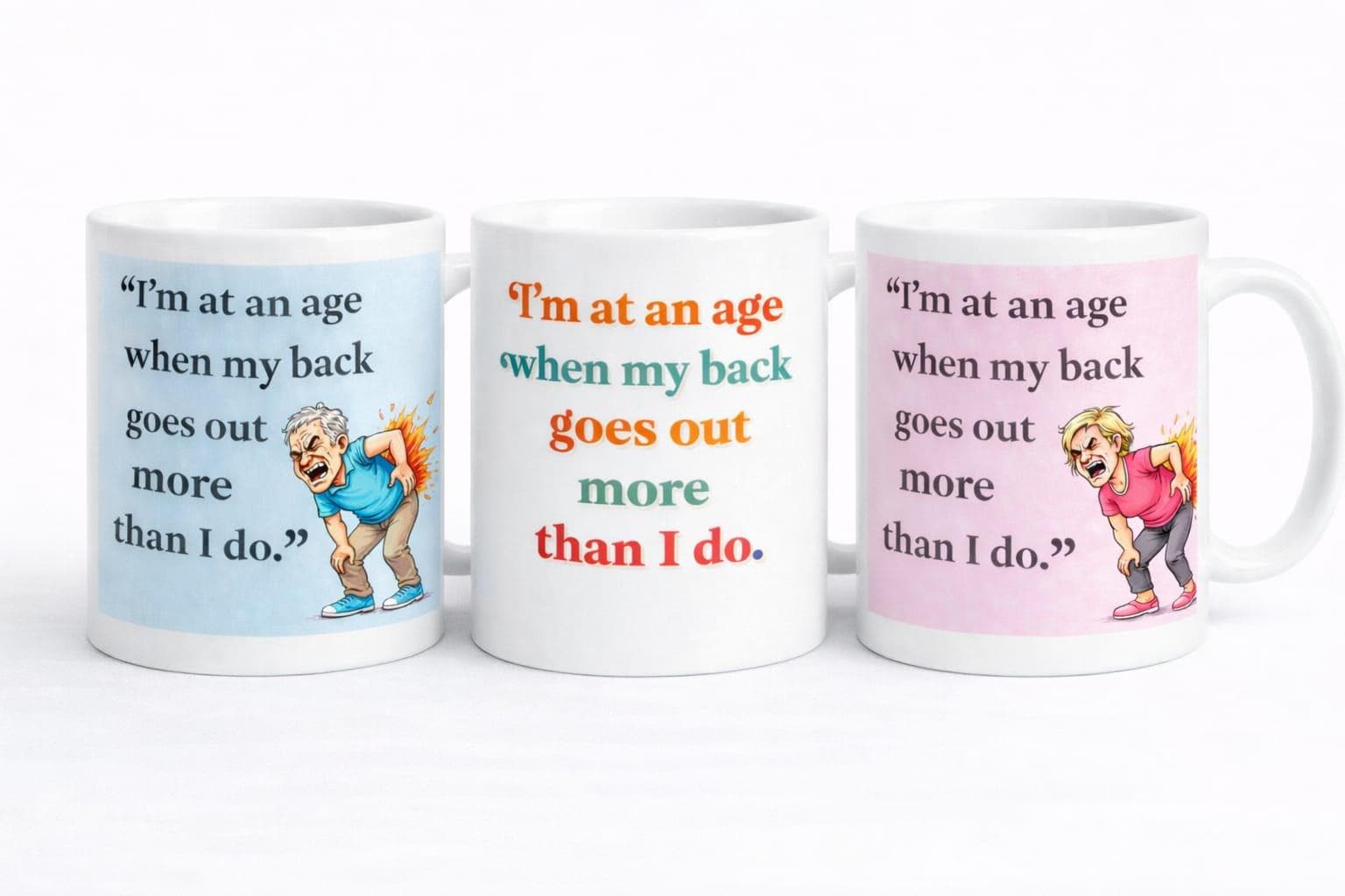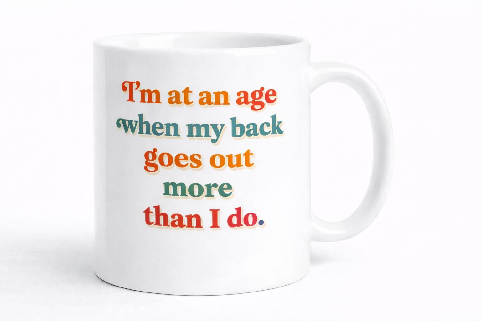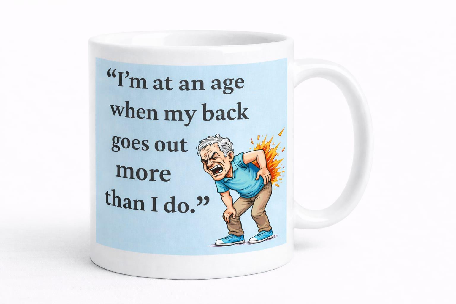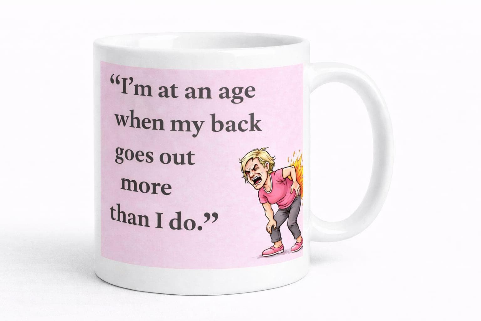 “I’m at an age when my back goes out more than I do”, paired with a humorous illustration on a soft pink background, this mug perfectly captures the reality of getting older with a sense of humour.
