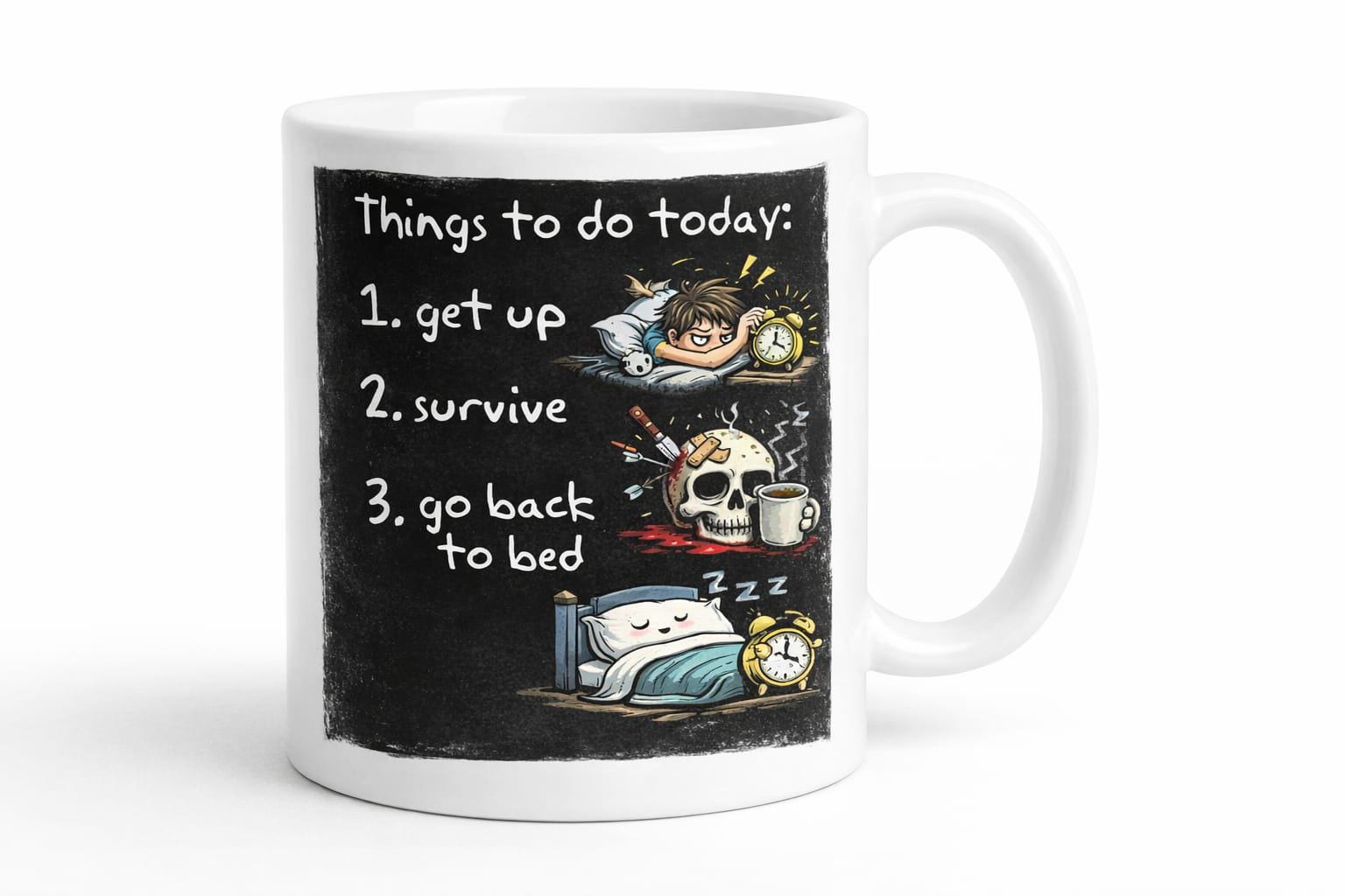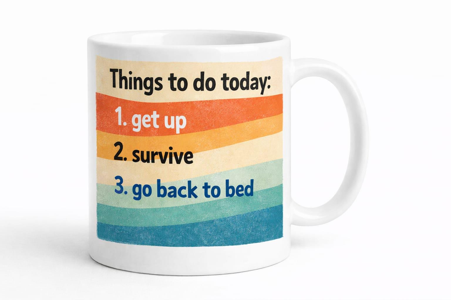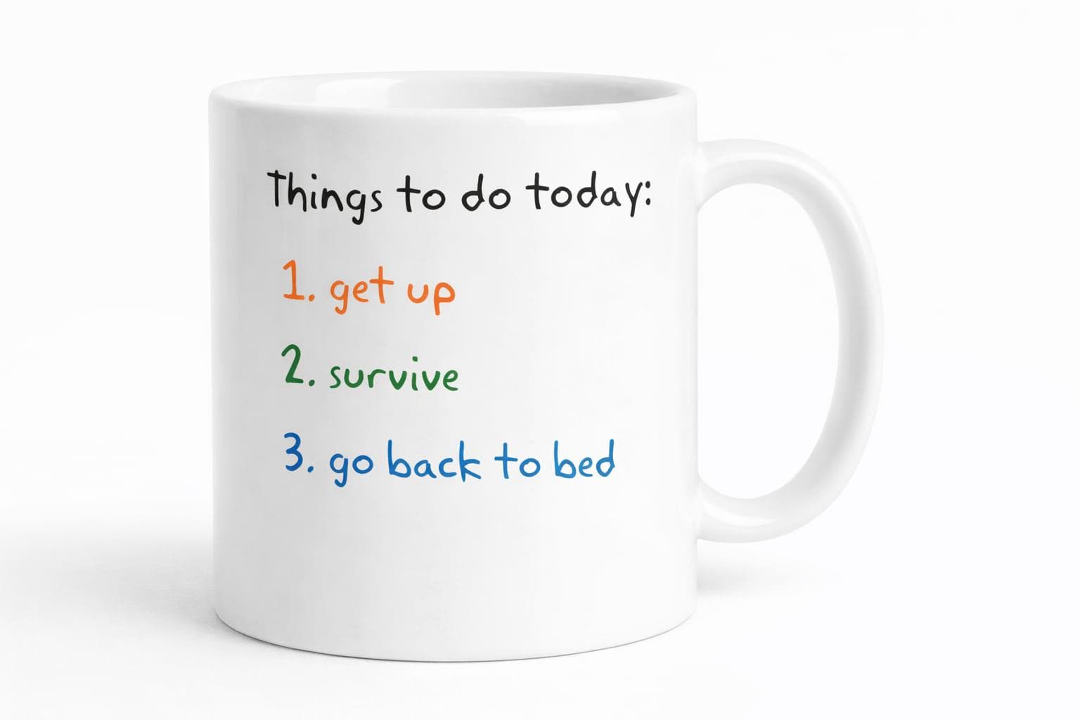 Some days, this is the entire plan. This funny to-do list mug features the relatable checklist: