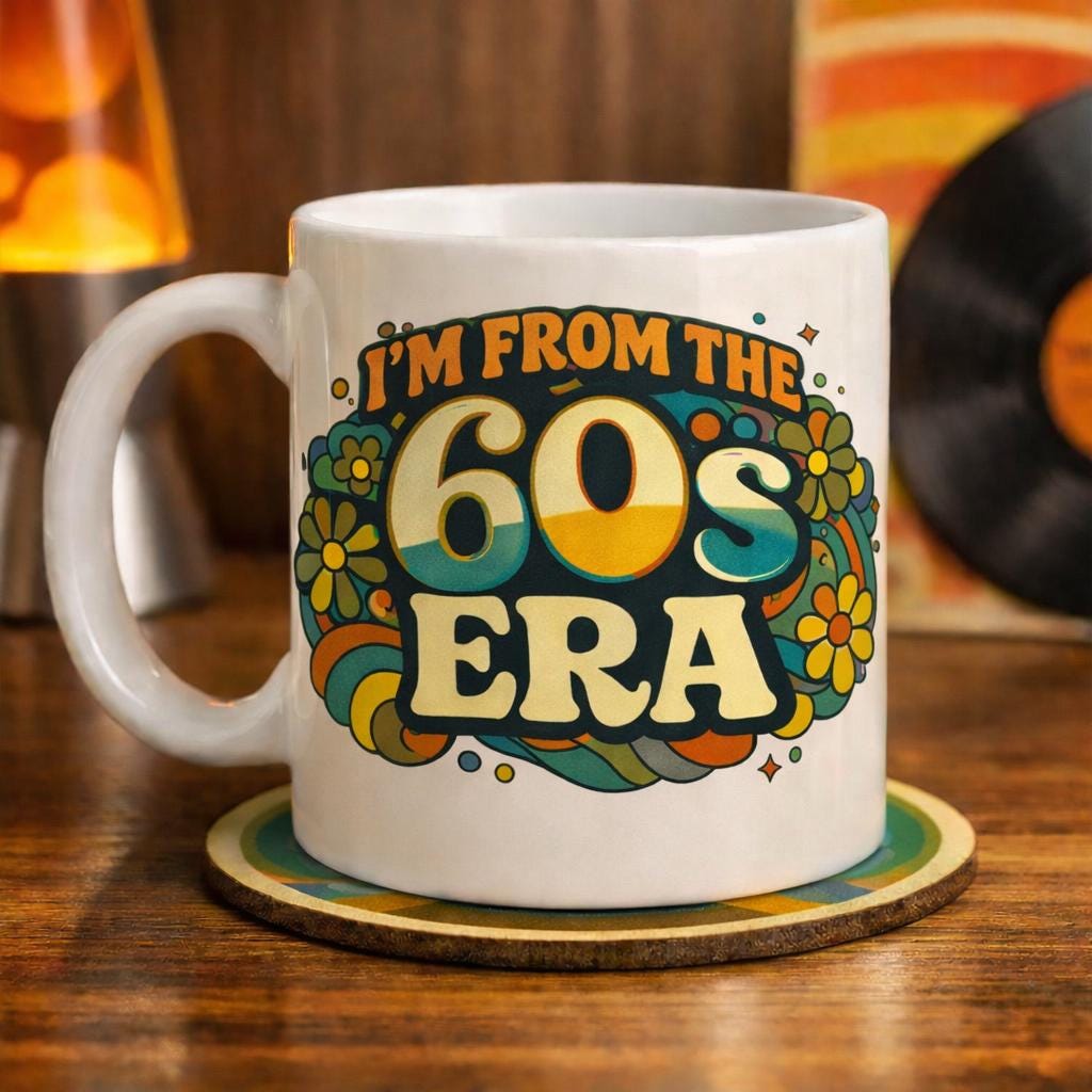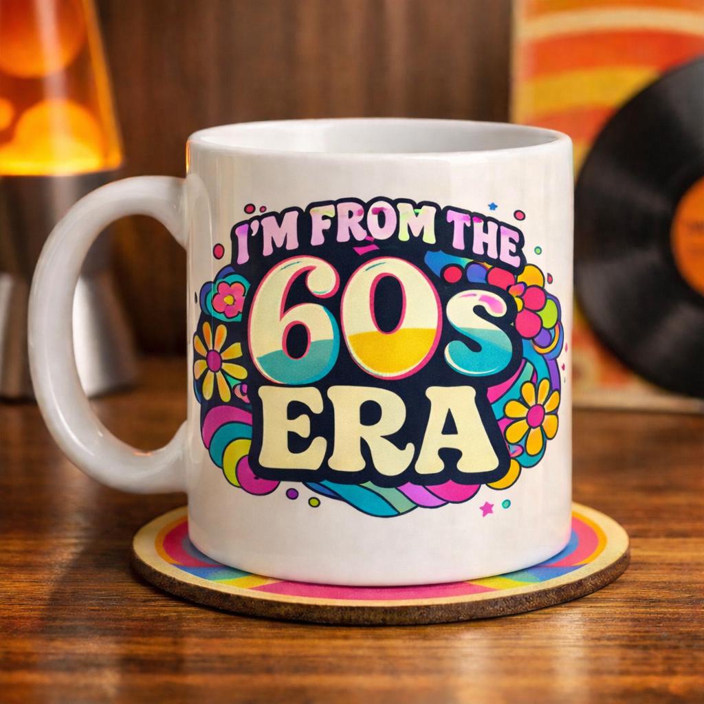 Celebrate serious retro vibes with this I’m From the 60s Era mug, featuring bold psychedelic typography, flowing shapes, and classic flower power details inspired by true 1960s design. Perfect for anyone who loves vintage style, nostalgic décor, and a good cuppa with personality.