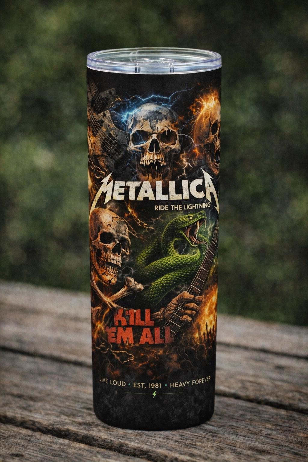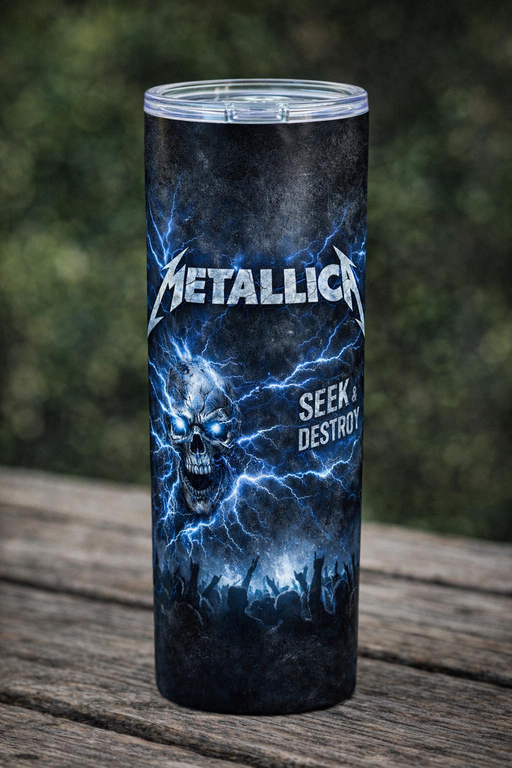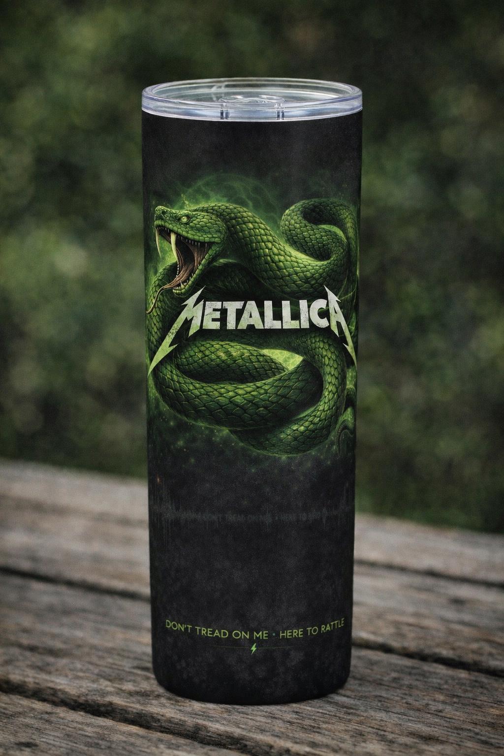 Turn up the volume with this Metallica-inspired 20oz stainless steel tumbler, designed for true metal fans. Featuring bold, high-impact artwork inspired by the raw energy of heavy metal, each design captures the power of iconic album eras with dramatic visuals including lightning, skulls, fire, and serpents.