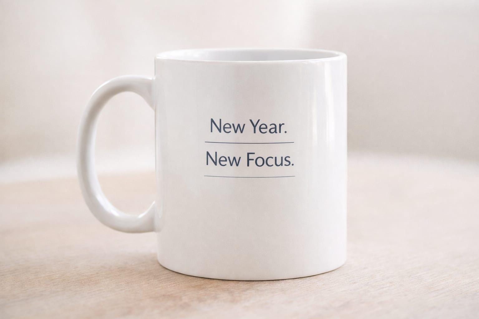 “New Year. New Focus.”, printed in a clean, modern font on a classic white ceramic mug.