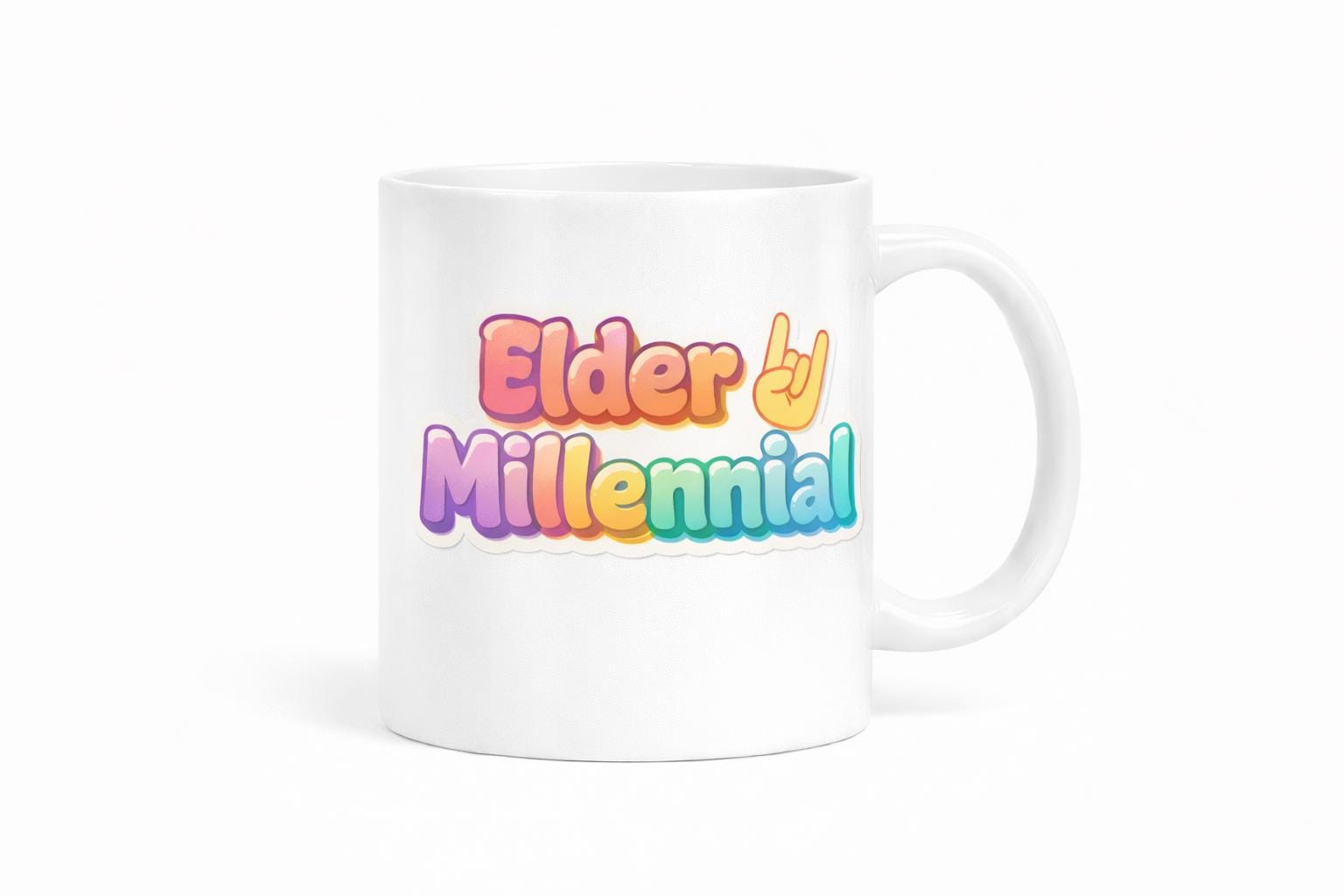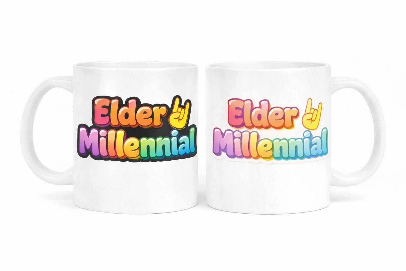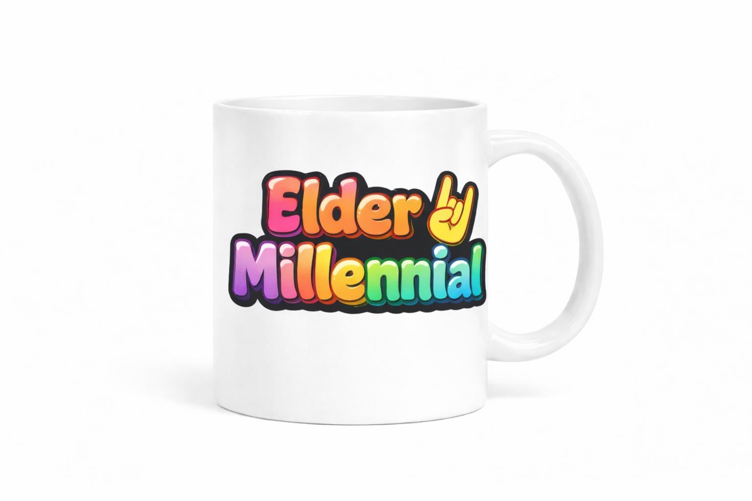For those who remember dial-up internet, MSN Messenger, and burning CDs… this one’s for you. The Elder Millennial mug is a fun, nostalgic nod to growing up between eras, featuring bold colourful lettering and a playful rock hand gesture.