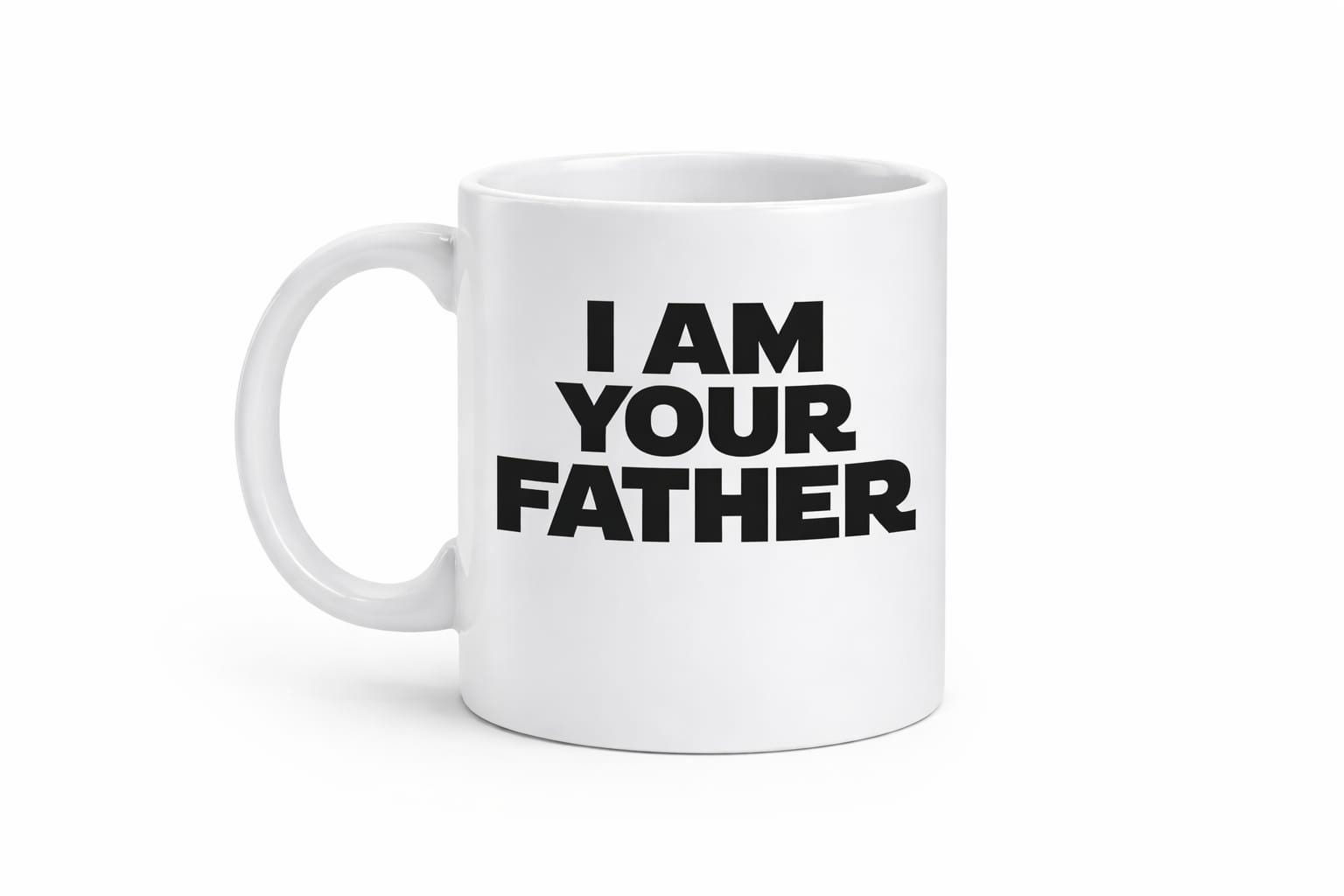 This minimalist white ceramic mug features the statement “I AM YOUR FATHER” in strong black lettering. A clean, modern design that delivers maximum impact with zero fuss – perfect for fans of classic movie quotes, dads with a sense of humour, or anyone who enjoys a confident, tongue-in-cheek mug for their daily brew.