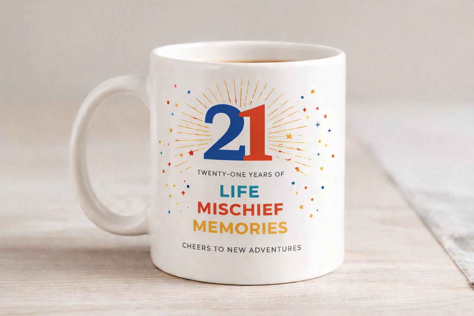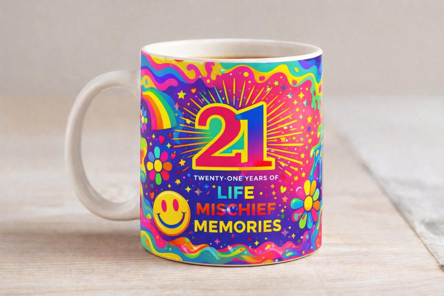 Celebrate a milestone birthday in style with this fun and colourful 21st birthday mug. Featuring the bold number 21 and the phrase