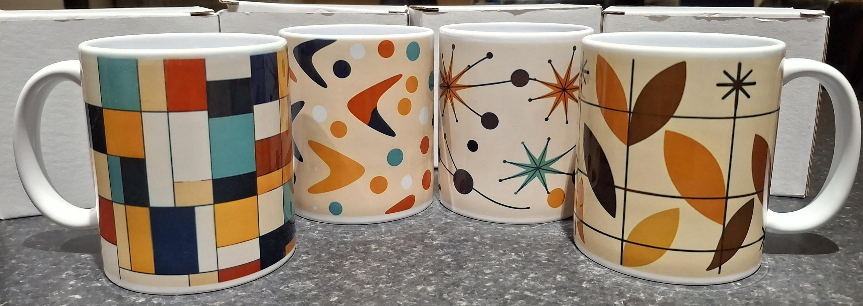 Bring a touch of retro charm to your daily coffee or tea with this Mid Century Modern mug set. Featuring bold geometric patterns, atomic starbursts, abstract shapes, and warm vintage tones, each mug showcases a unique design while perfectly complementing the set as a whole.