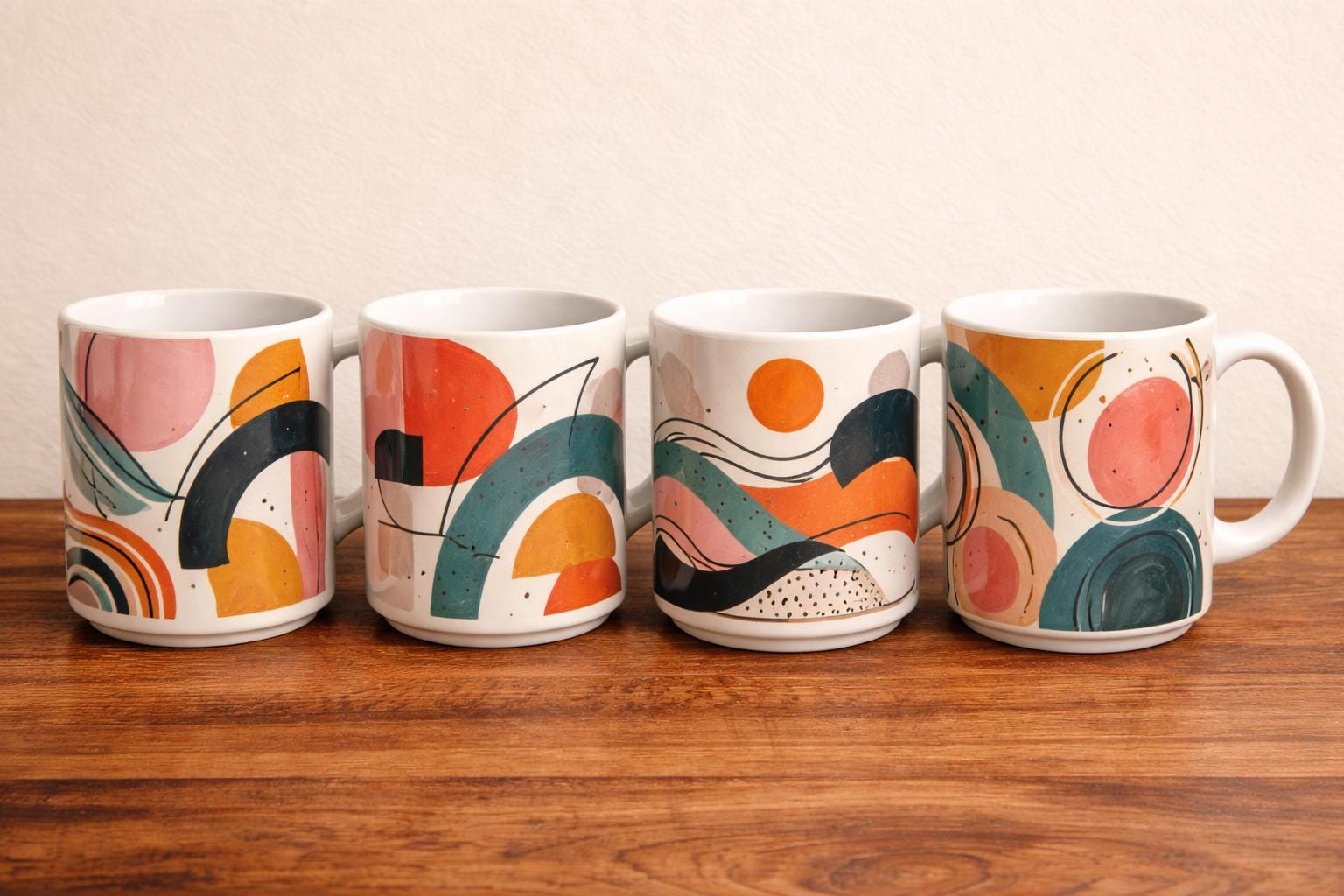 Add a bold splash of colour and creativity to your daily coffee or tea with this abstract modern mug set. Featuring flowing shapes, layered curves, and soft yet vibrant tones of terracotta, teal, blush, and ochre, each mug showcases a unique artistic design while forming a beautifully coordinated set.
