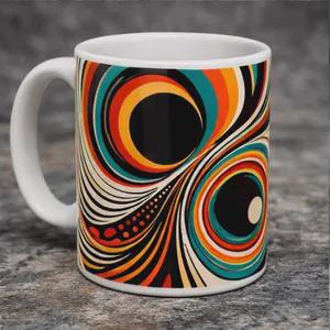 This eye-catching ceramic mug features a mesmerizing psychedelic design inspired by 1970s op art and retro aesthetics. With bold concentric circles, flowing curves, and a vibrant color palette of orange, teal, black, and cream, this mug is a conversation starter that brings groovy energy to any beverage break.