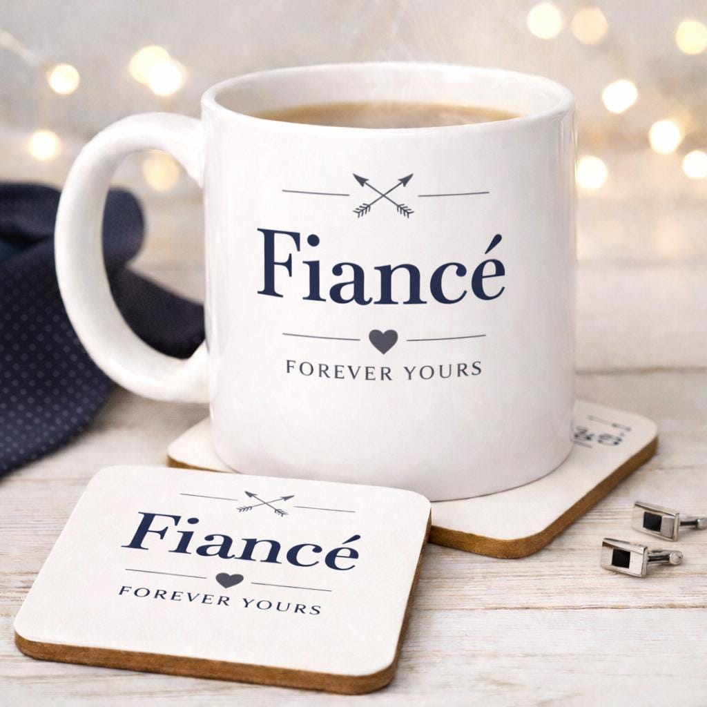 This Fiancé mug and coaster set is designed with a clean, understated style that suits everyday use while still feeling meaningful and romantic.