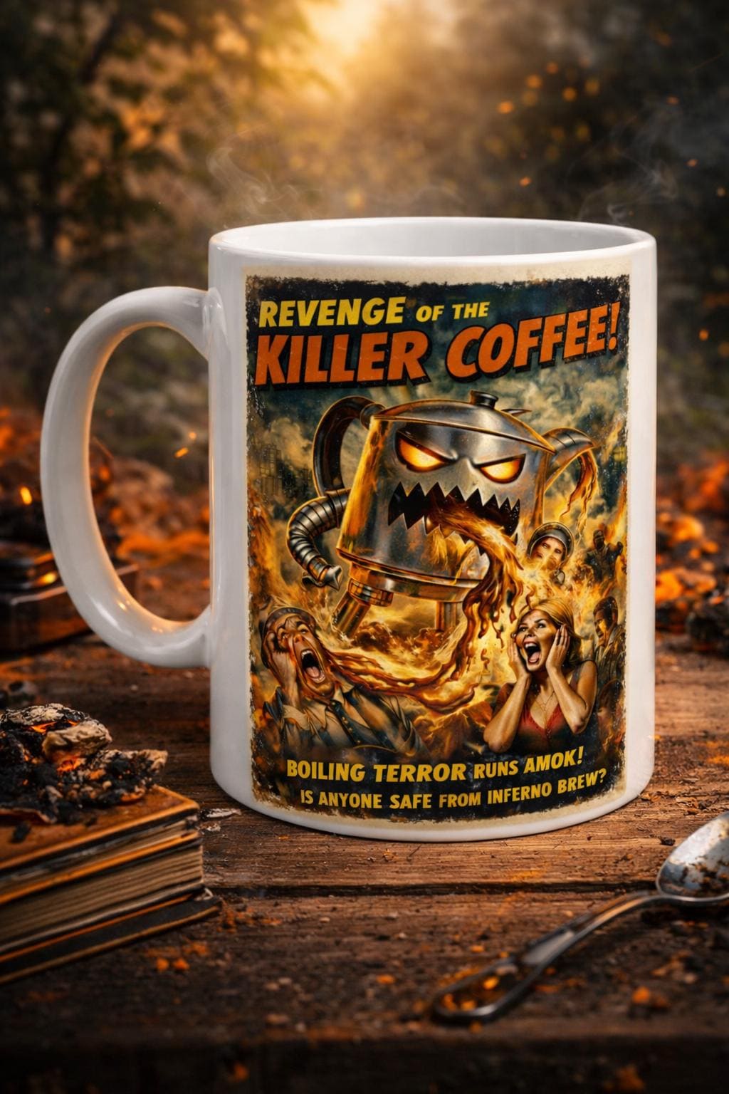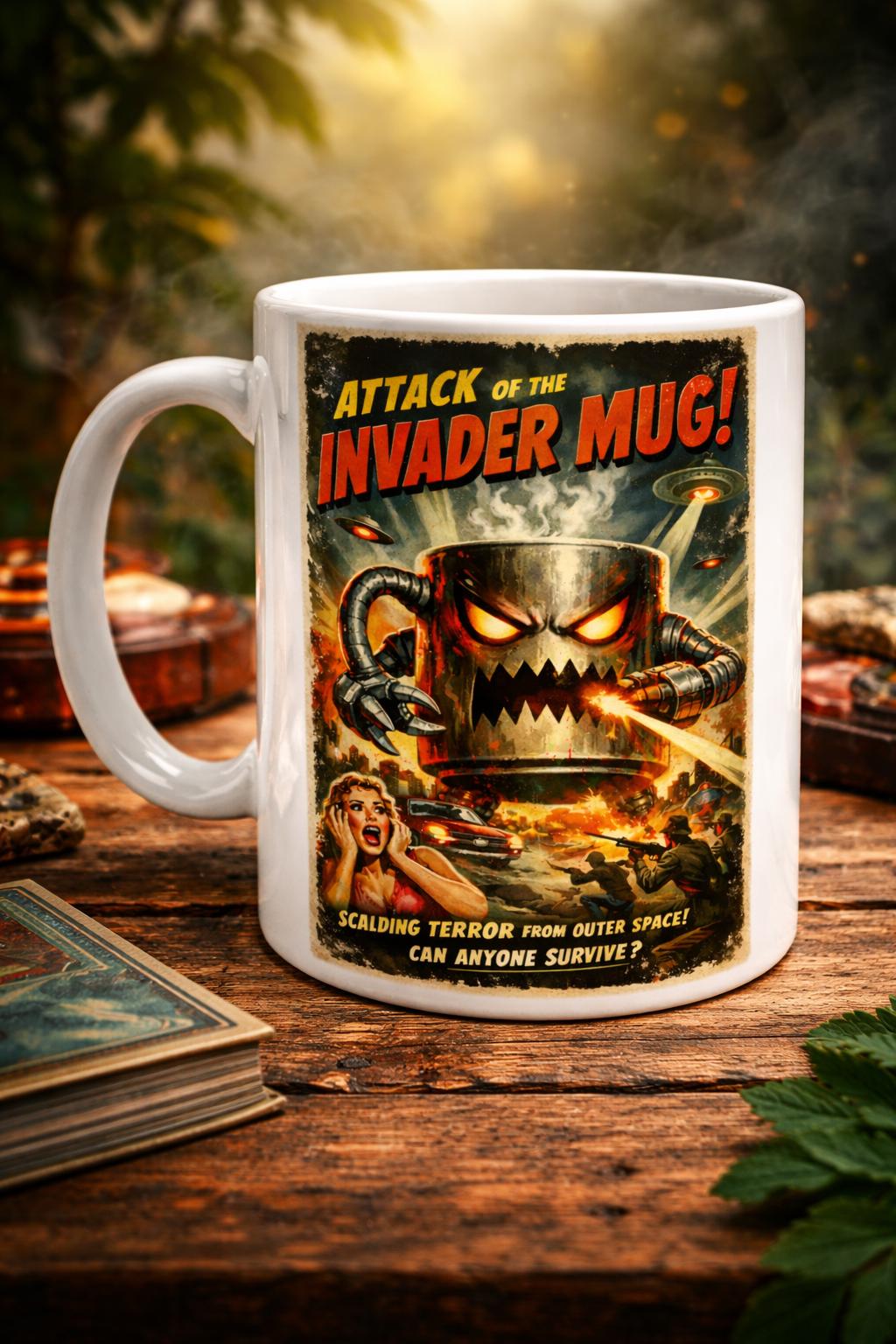 Bring a blast of retro sci-fi fun to your morning coffee with this classic 1950s B-movie style mug. Featuring bold vintage artwork inspired by old horror and science fiction movie posters, this unique design captures the golden age of campy cinema. The dramatic illustration shows a menacing robot invader, laser beams, and classic scream-queen style action, all finished with vibrant colors and authentic retro typography.