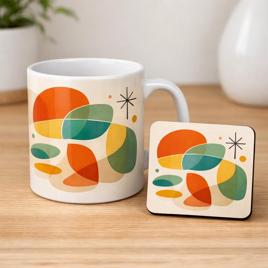 Bring timeless mid century style to your daily coffee or tea with this elegant abstract mug and coaster set. Inspired by classic 1950s modernist design, the artwork features layered organic shapes in warm orange, mustard, teal, and olive tones, finished with subtle starburst detailing for a true retro feel.