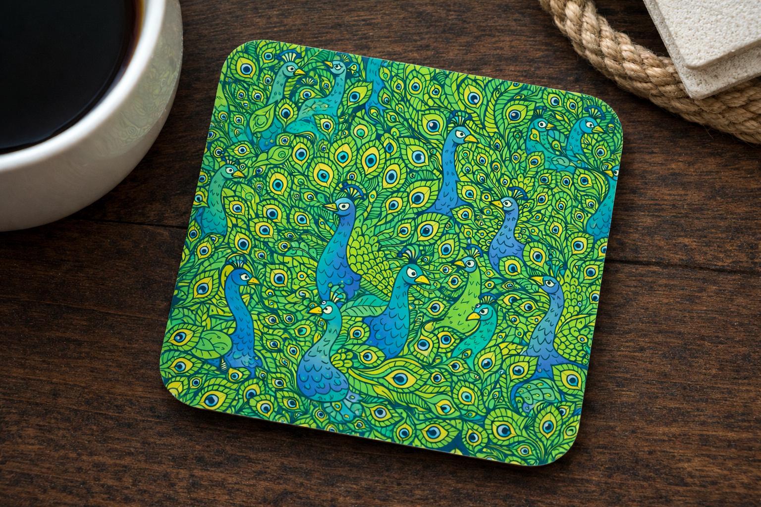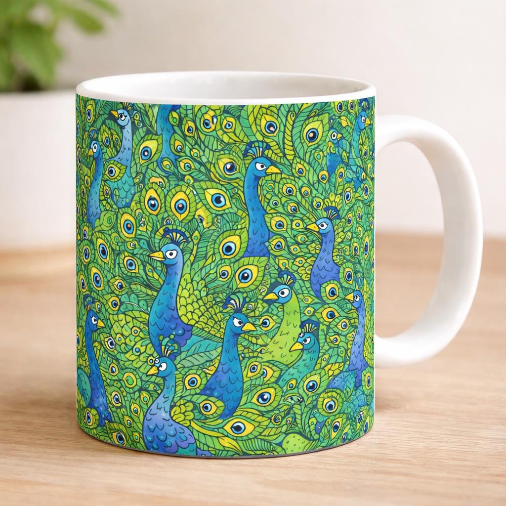 Bring colour and character to your daily brew with this beautifully illustrated peacock mug and matching coaster set. Featuring an intricate all-over peacock pattern in rich blues, greens and golden tones, this design is inspired by nature and decorative folk art, making it a striking addition to any home.