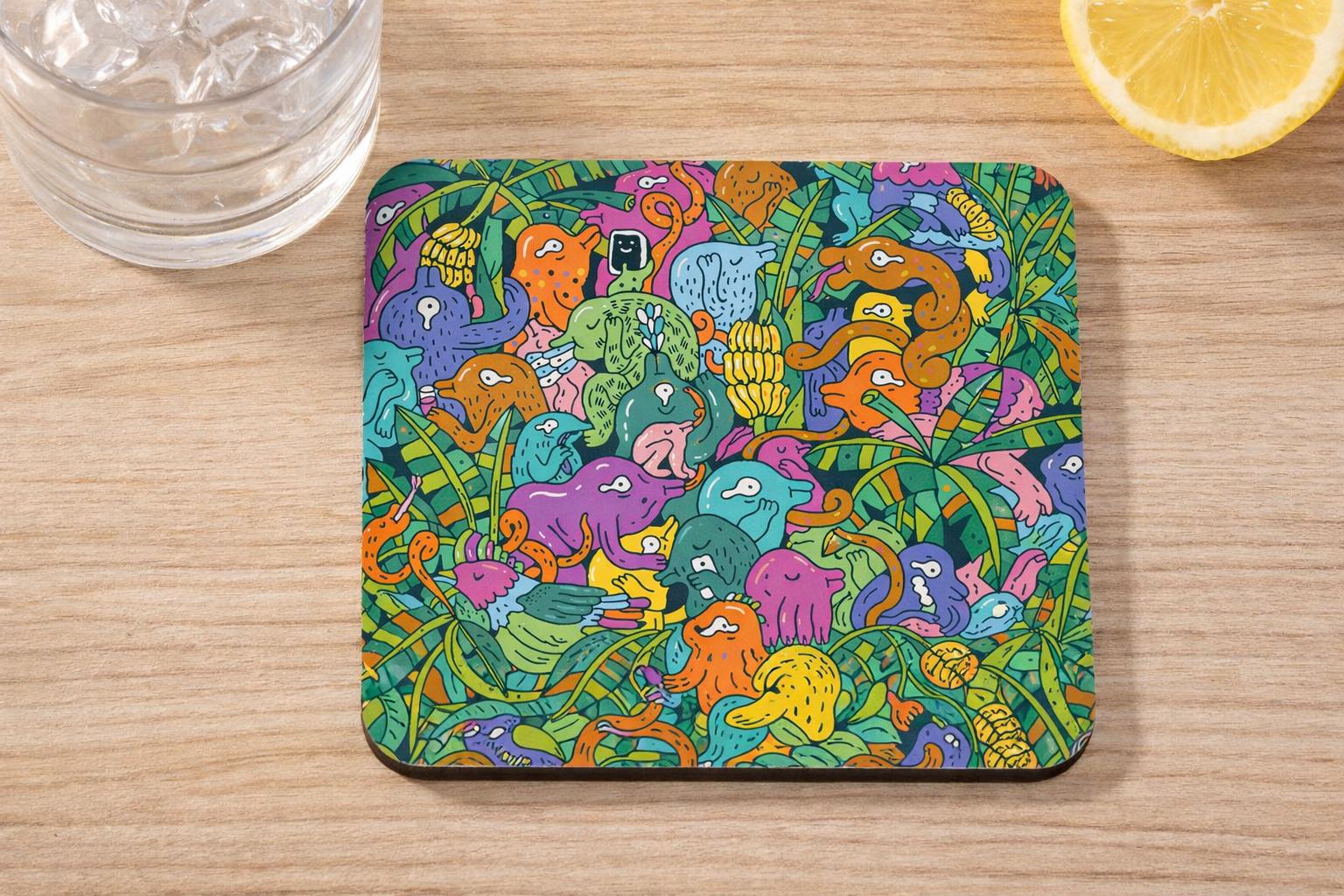 Bring a splash of colour and personality to your coffee break with this vibrant whimsical mug and coaster set. Featuring a playful jungle-inspired illustration filled with abstract creatures and lush foliage, this design is full of character and visual interest, making it a real conversation starter.