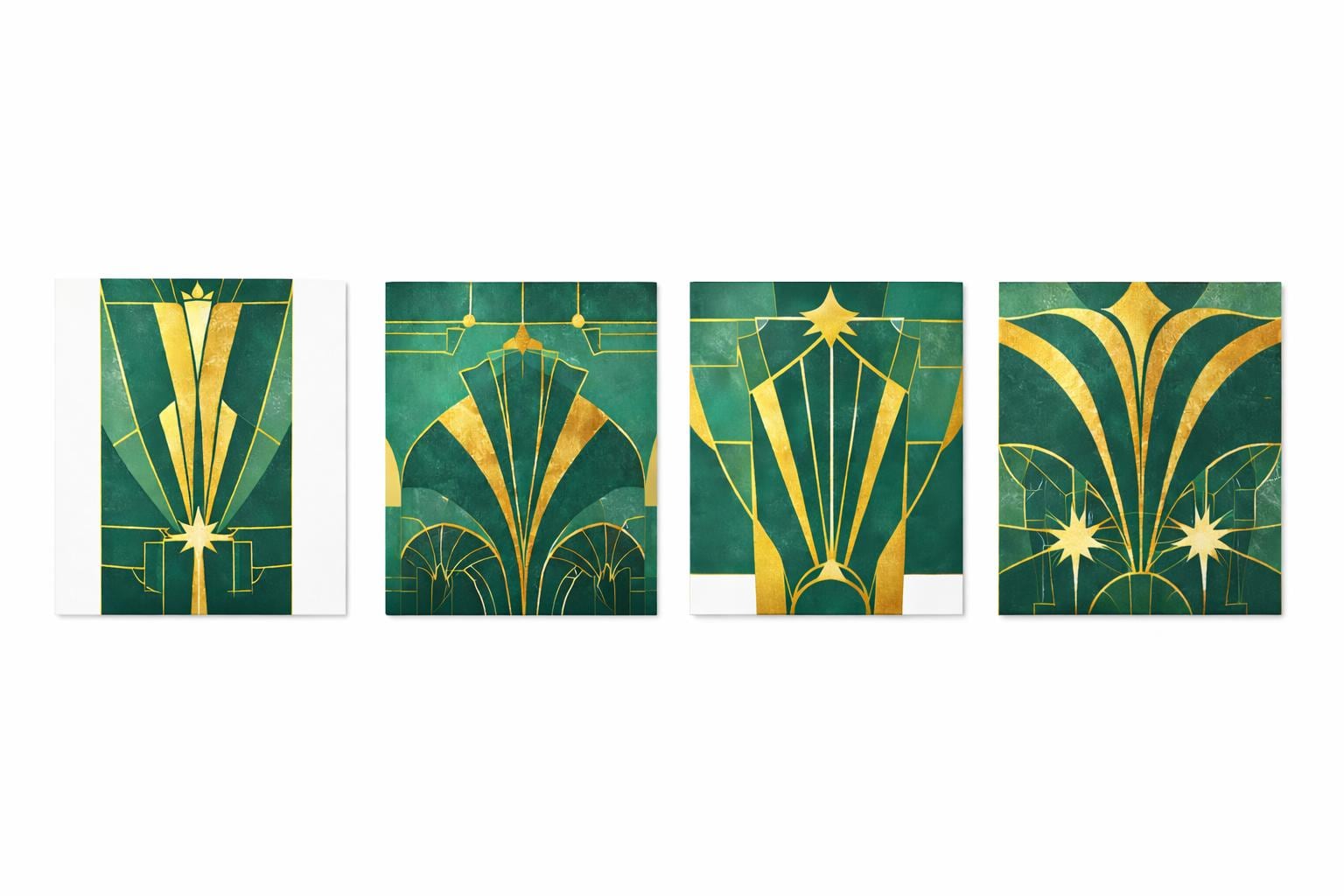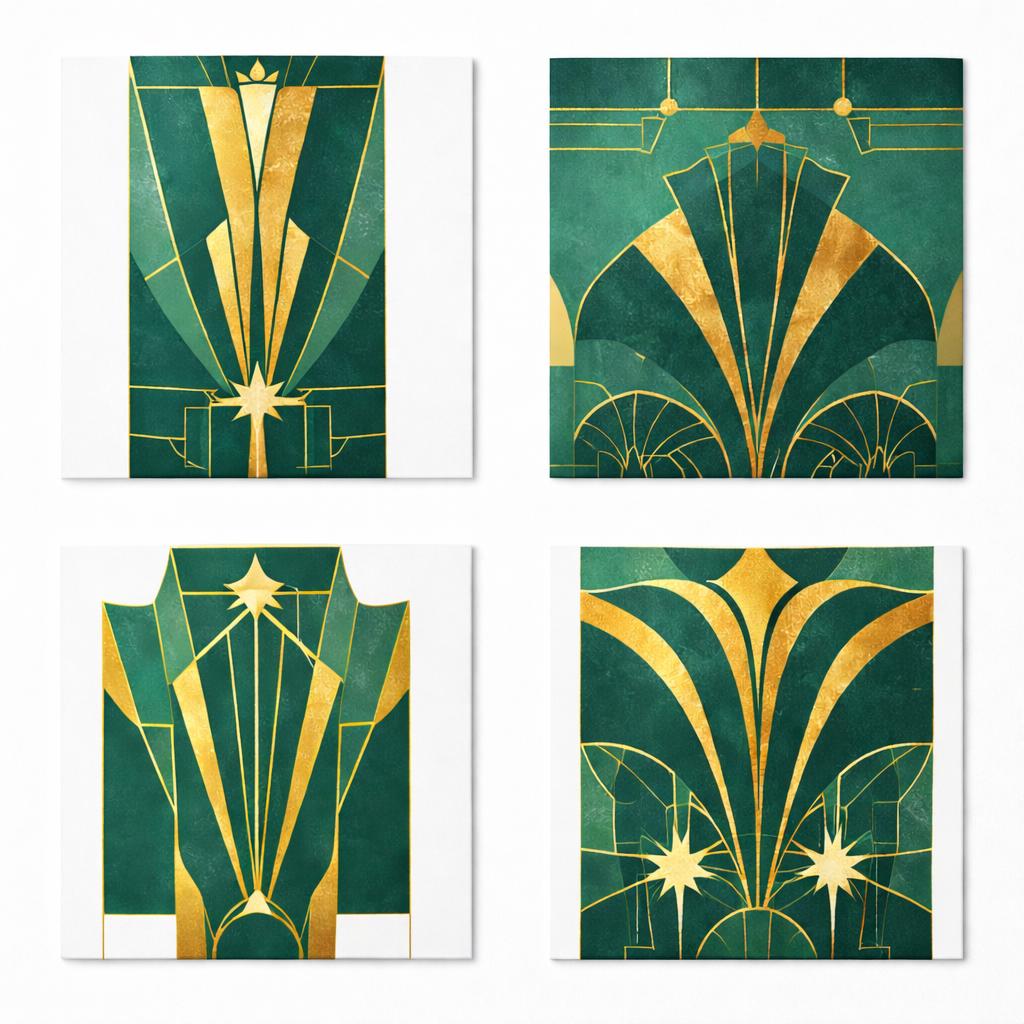 Add timeless elegance to your home with these Art Deco inspired corkwood coasters. Featuring rich emerald green tones paired with striking gold style geometric detailing, this design draws inspiration from classic 1920s Art Deco architecture and vintage glamour.