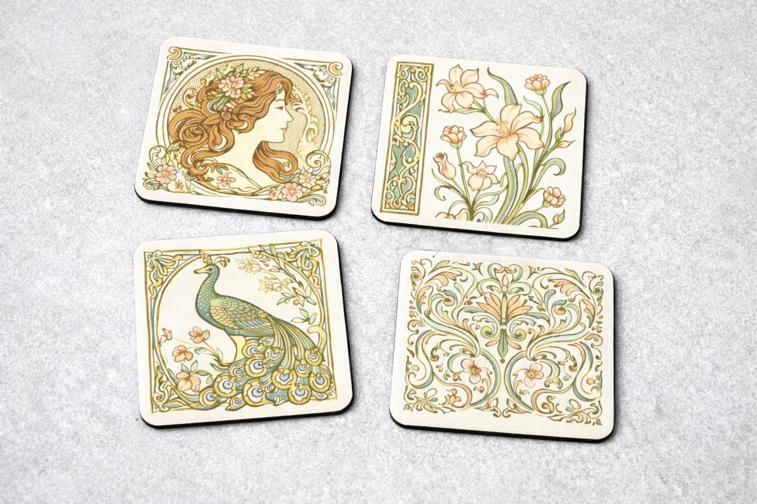Bring timeless elegance to your home with this beautiful Art Nouveau inspired coaster set, featuring four coordinated vintage-style designs. Each coaster showcases delicate flowing lines, soft pastel tones, and classic motifs including a graceful lady, floral panels, a peacock, and ornate botanical detailing.