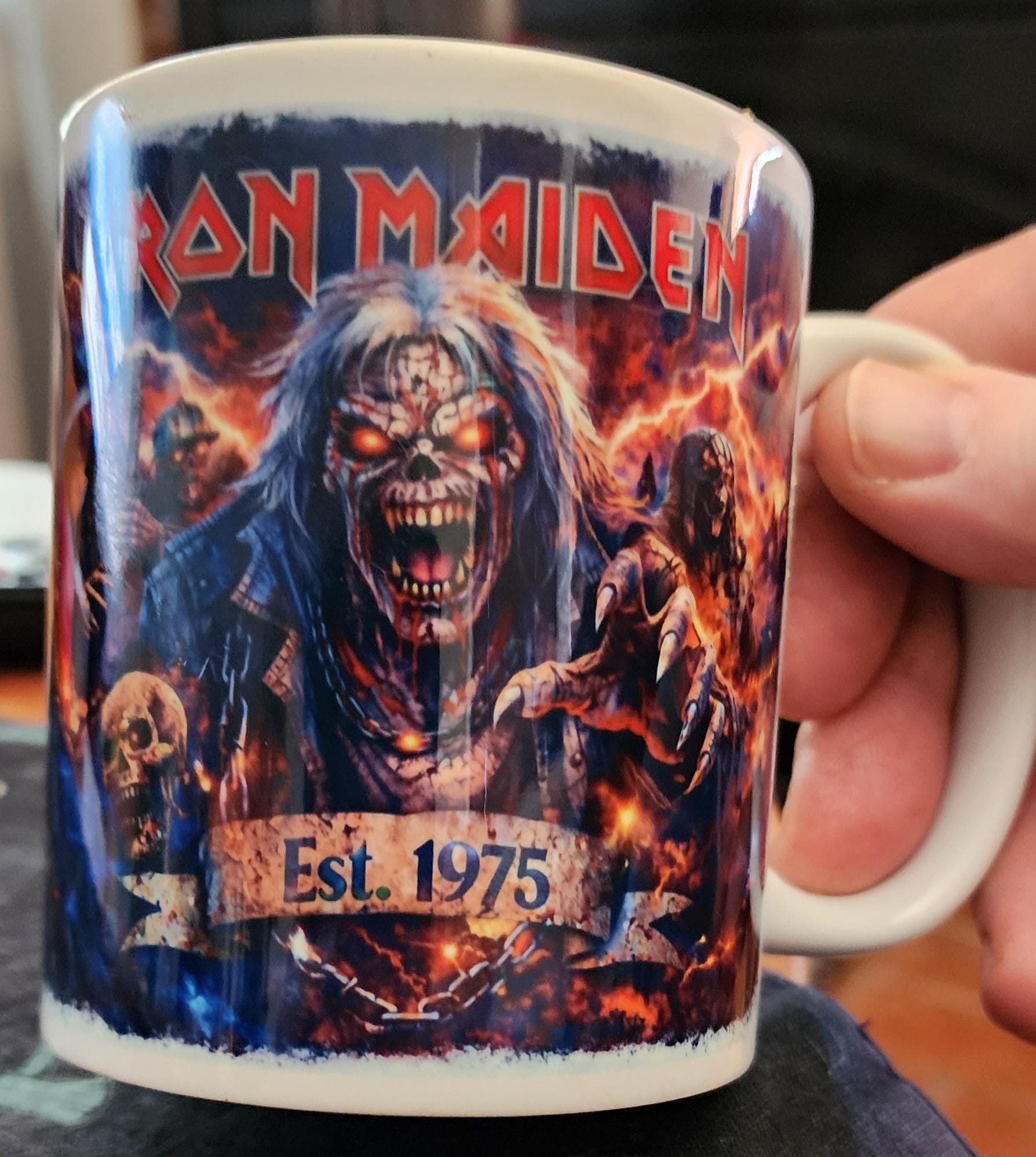Unleash your love for heavy metal with this striking Iron Maiden-inspired mug, featuring an intense Eddie-style artwork surrounded by fiery, electrifying detail and the iconic Est. 1975 tribute. Designed for true metal fans, this mug is a bold statement piece for your morning coffee, tea, or late-night brews.