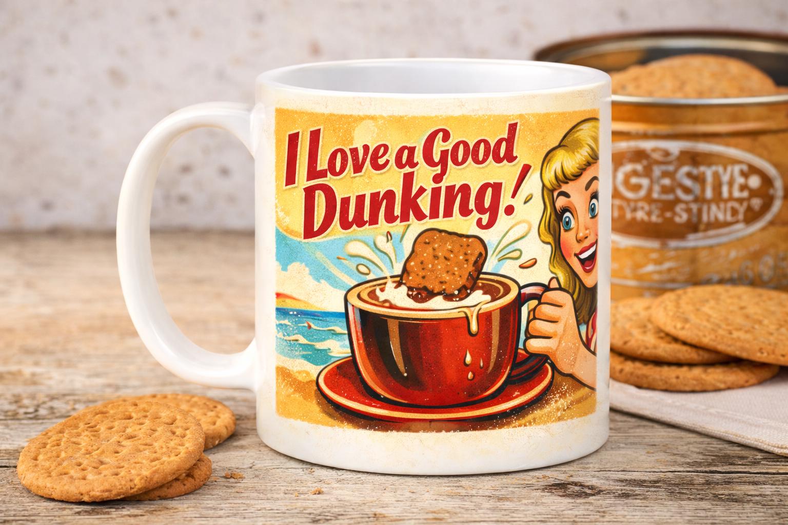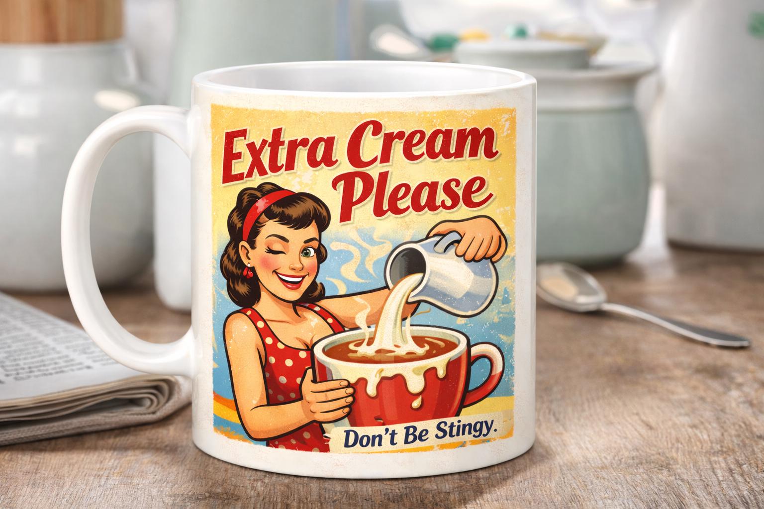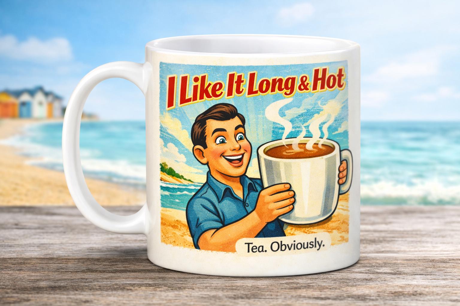 Start your morning with a proper laugh and a strong brew. This cheeky retro-style mug is inspired by classic British postcard humour and mid-century advertising, packed with playful double entendres that are naughty enough to raise an eyebrow, but polite enough for the office.