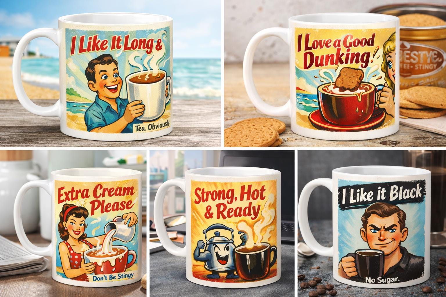 Featuring bold vintage artwork and witty slogans, this mug is perfect for tea lovers, coffee addicts, and anyone who enjoys a bit of British humour with their brew. Whether you like it long, strong, black, creamy, or ready to go – there’s a design here that says it all without saying too much.