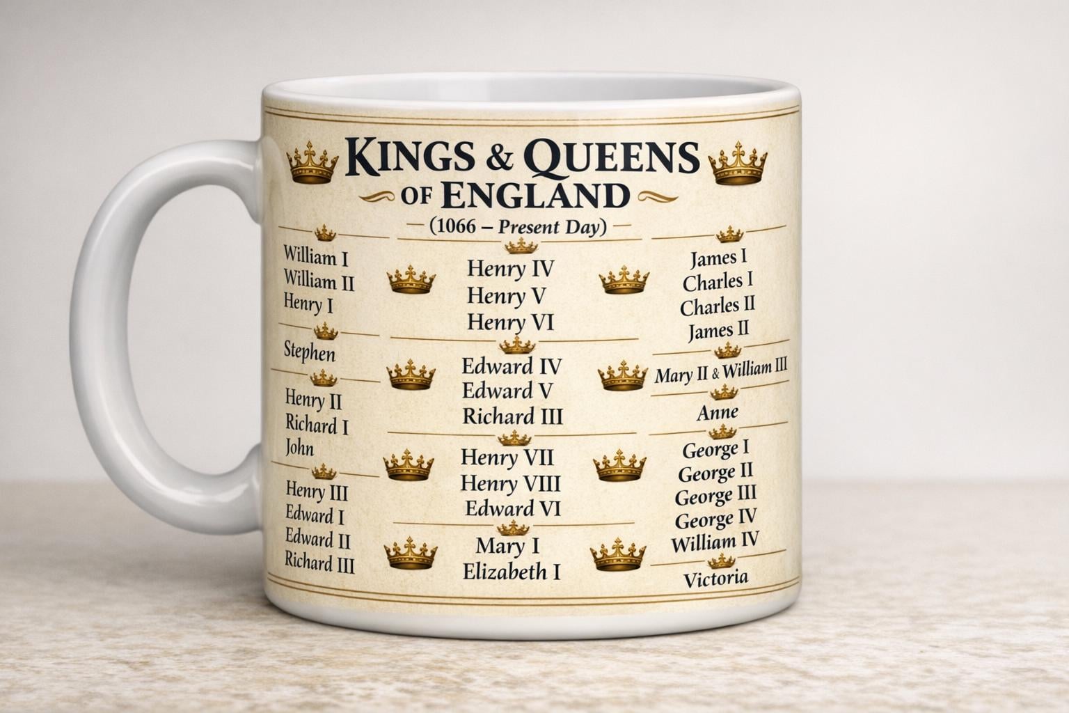 Designed in a classic parchment-style layout with elegant typography and crown details, this mug is both educational and stylish — perfect for history lovers, teachers, students, and anyone proud of England’s royal heritage.
