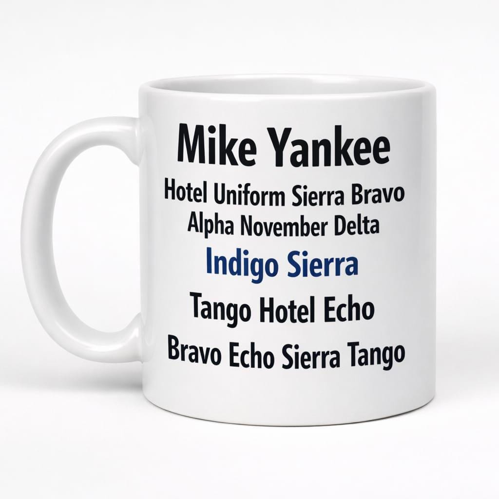 This bold NATO phonetic alphabet mug is a clever mix of military humour and clean typography. At first glance it looks like a standard radio call-out, but read closely and the phonetic wording reveals a tongue-in-cheek message that will be instantly appreciated by anyone familiar with military, radio, or signals culture.