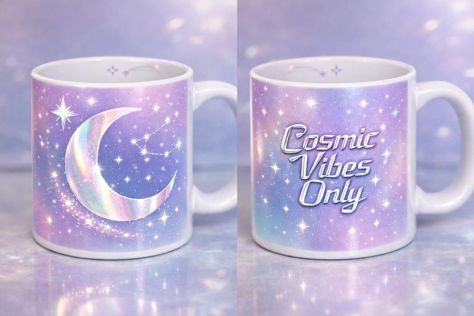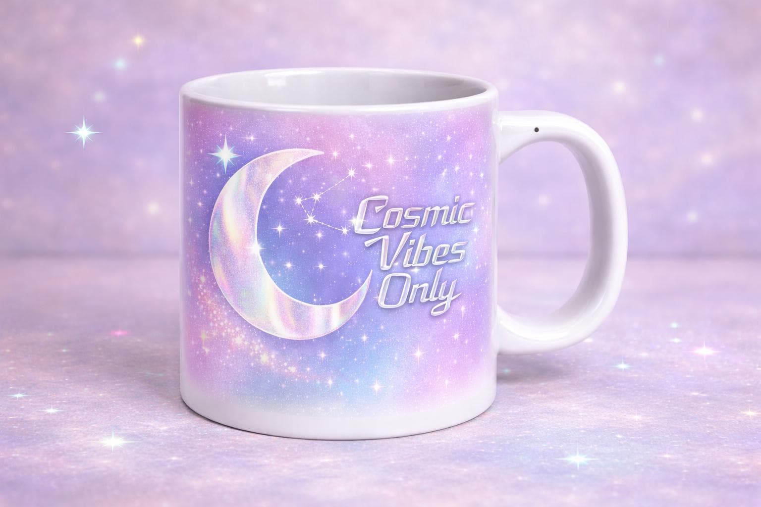 Bring a little magic to your daily routine with this enchanting Cosmic Vibes Only mug. Featuring a shimmering crescent moon on one side and the phrase “Cosmic Vibes Only” on the other, set against a soft pastel galaxy background, this mug is calm, mystical, and full of celestial charm.