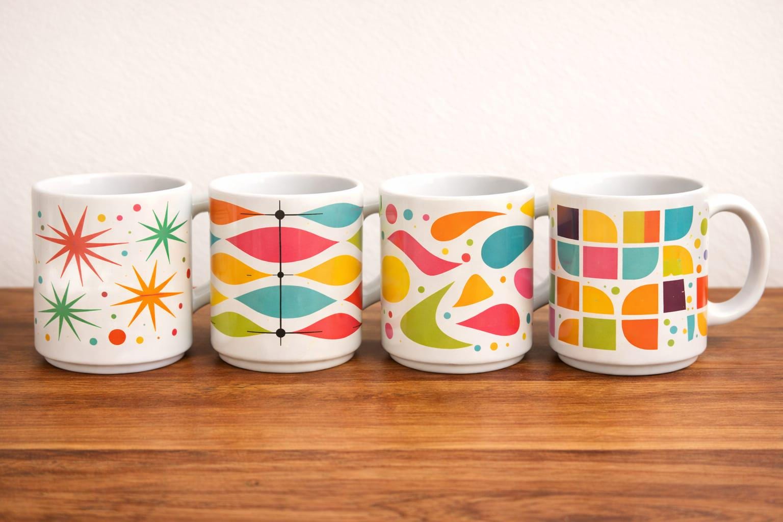 This vibrant mid-century modern mug set is a celebration of colour, pattern, and timeless retro design. Featuring four coordinating mugs, each with a unique abstract pattern inspired by classic 1950s and 1960s aesthetics, this set brings instant character to any kitchen or coffee break.