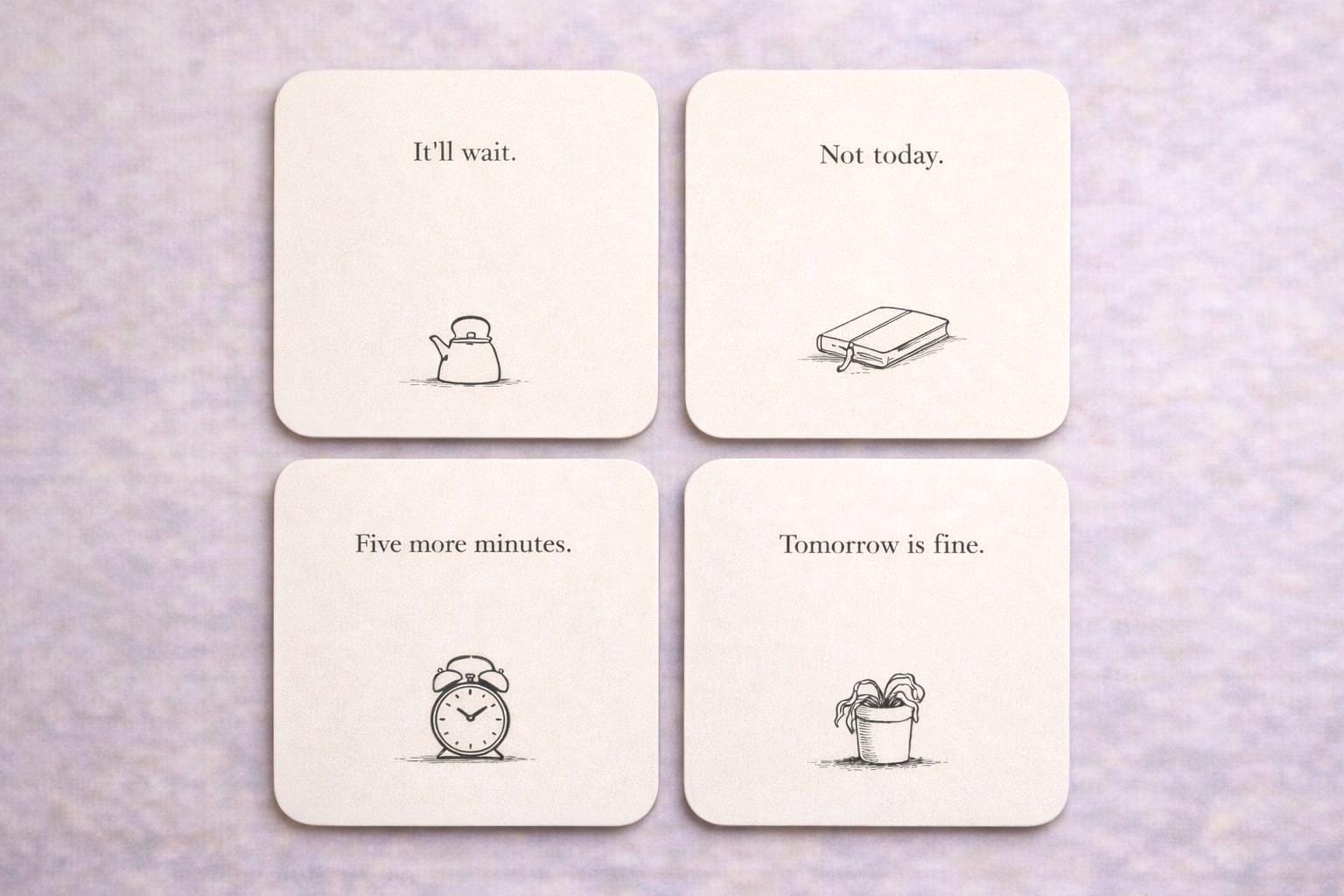 This minimalist coaster set captures the gentle humour of taking life at a slower pace. Featuring four softly worded phrases — It’ll wait. Not today. Five more minutes. Tomorrow is fine. — each coaster is paired with a delicate line illustration, creating a calm, understated design that feels both thoughtful and relatable.