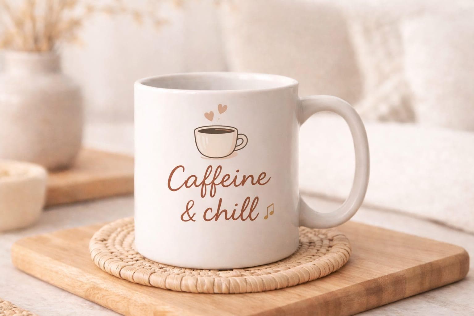 Cosy, playful, and effortlessly calming, this Caffeine & Chill mug is made for slow mornings, relaxed afternoons, and peaceful coffee breaks. Featuring a cute coffee cup illustration with soft heart details and warm neutral tones, it brings a gentle, feel-good vibe to any space.