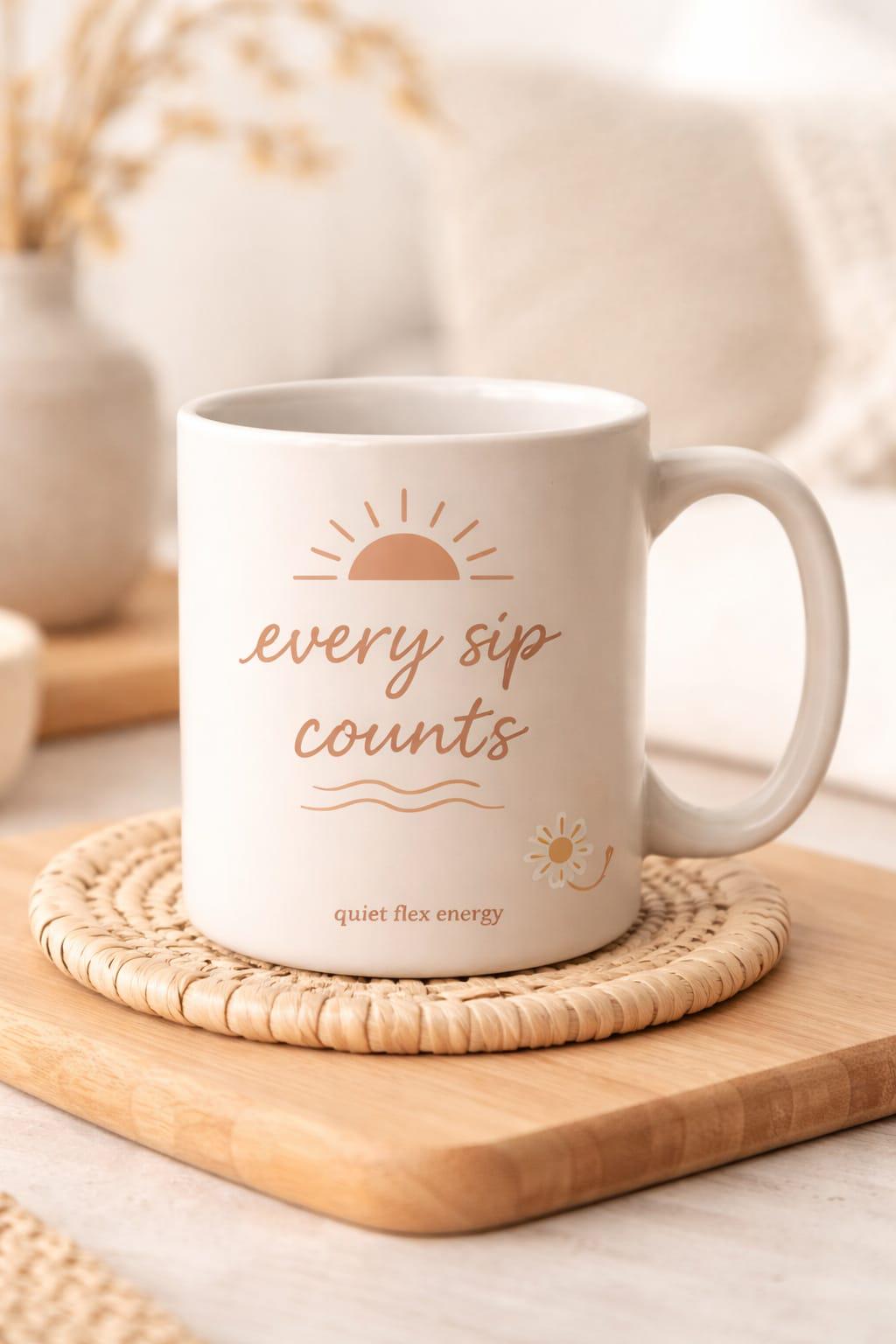 Gentle, intentional, and quietly motivating, this Every Sip Counts mug is designed for mindful mornings and slow, grounding routines. Featuring soft sunrise iconography, flowing line details, and warm neutral tones, it brings calm confidence and understated positivity to your day.