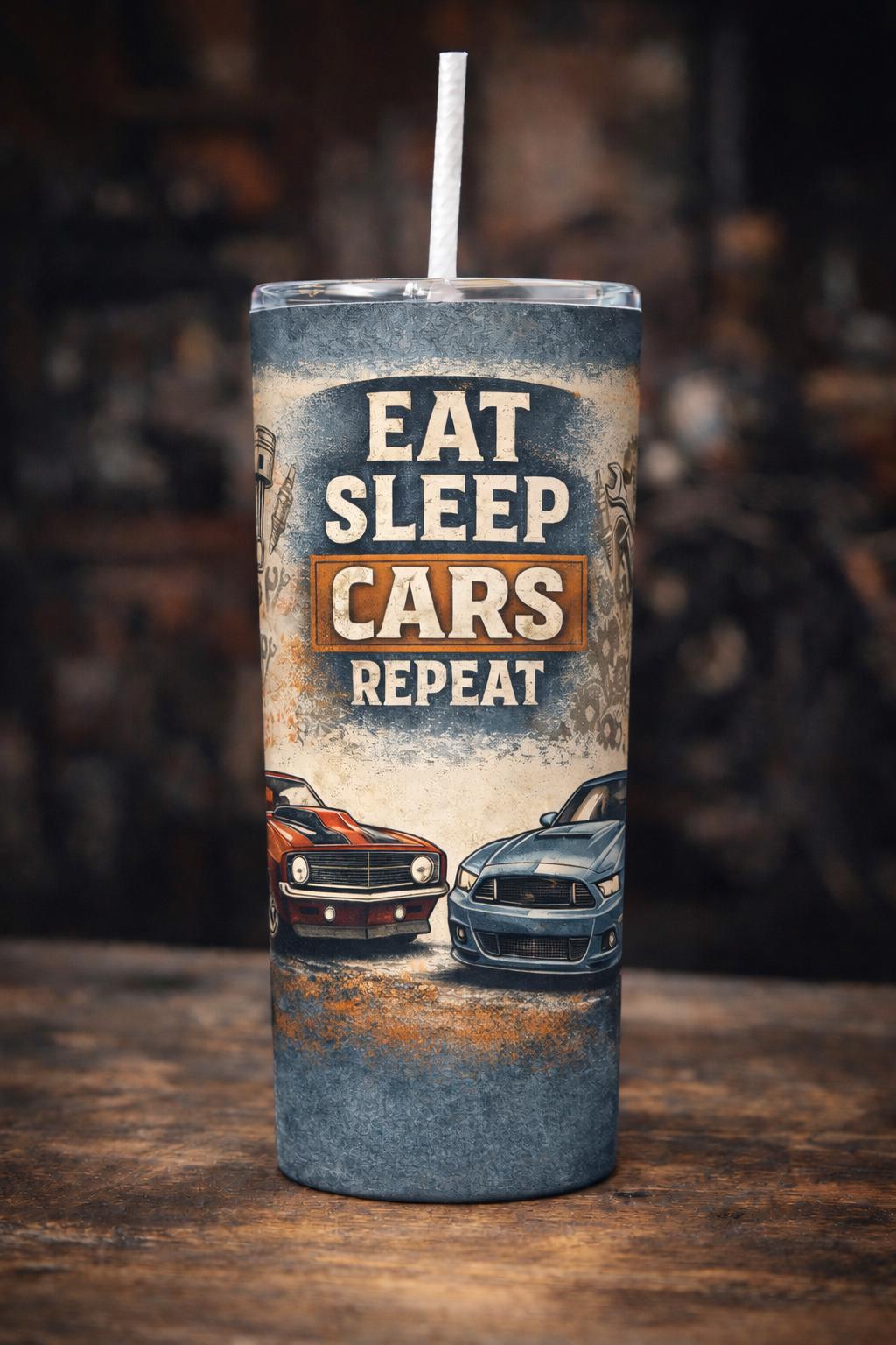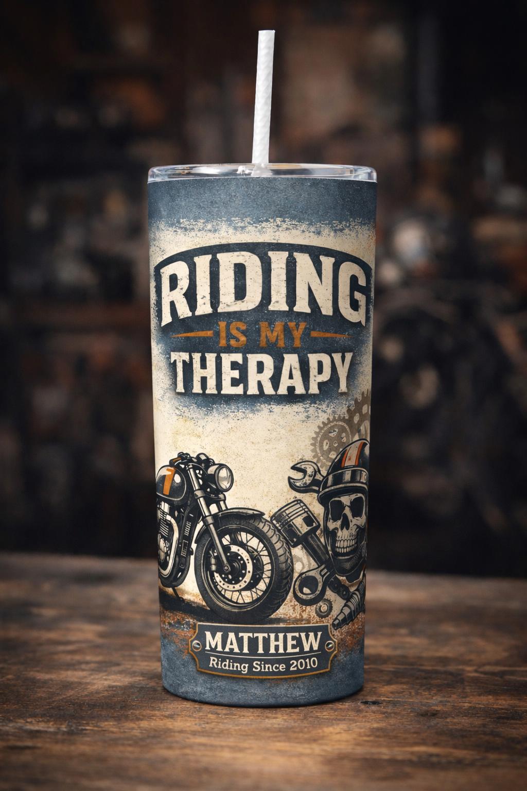Message if you require personalisation Fuel your passion on the go with this bold 20oz stainless steel tumbler, designed for true motorcycle and car enthusiasts. Featuring a rugged vintage workshop aesthetic, this tumbler showcases iconic biker and car graphics with the popular slogans “Riding Is My Therapy” and “Eat Sleep Cars Repeat”.